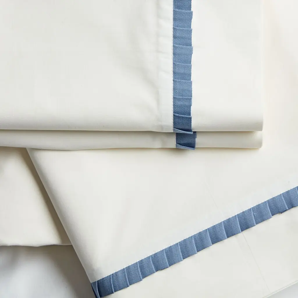 Designed in collaboration with Celerie Kemble exclusively for One Kings Lane: Crafted of white cotton with pleated blue trim on the flat sheet and pillowcases, this tailored sheet set exudes a playful simplicity.