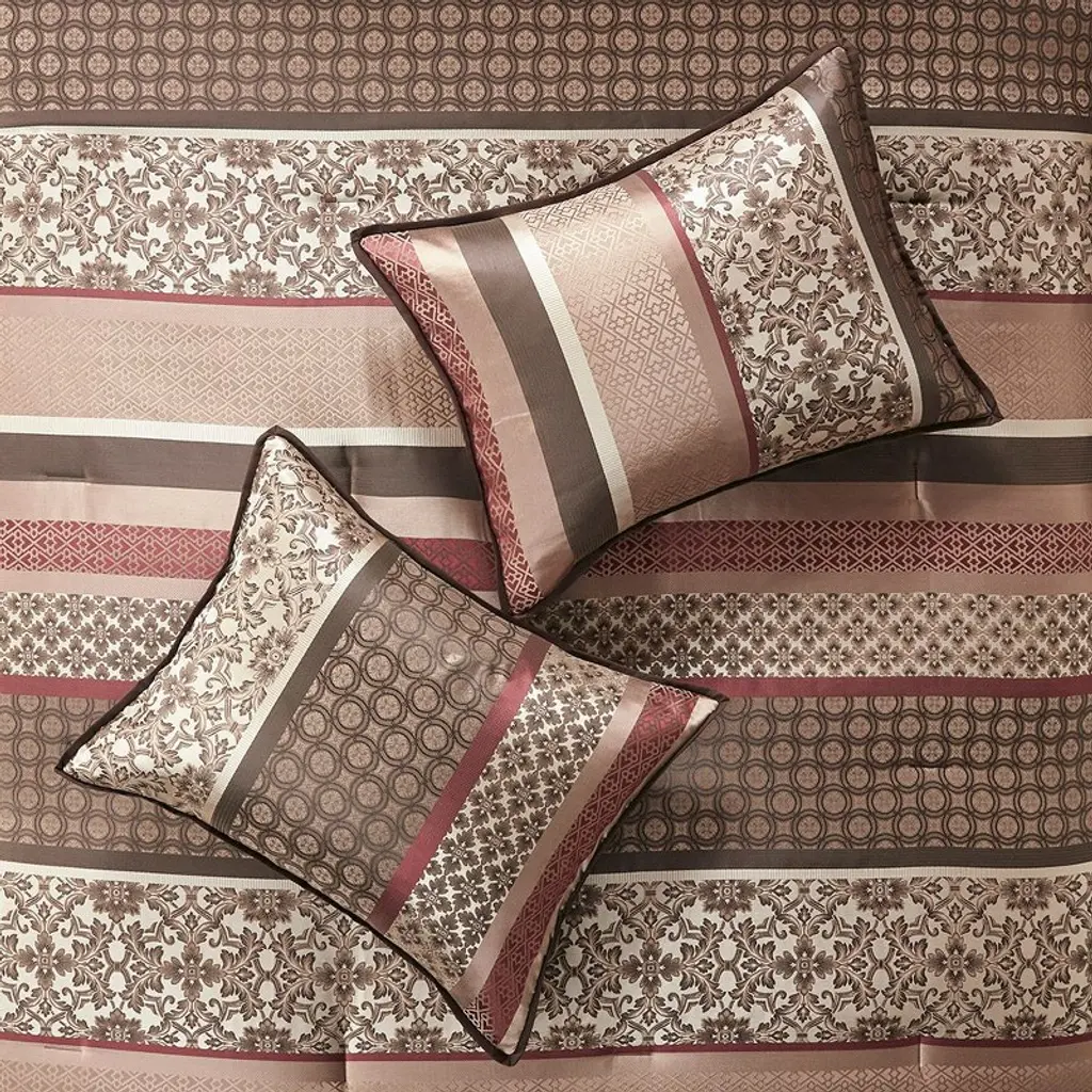 Elevate your bedroom with the timeless elegance of the Princeton 7 Piece Comforter Set. Featuring an intricate blend of geometric and damask patterns in rich brown, red, and ivory tones, this set adds warmth and character to any space. Crafted from durable polyester jacquard with a soft brushed polyester reverse, the comforter offers both style and comfort. The set includes two king-size shams and three beautifully embroidered decorative pillows that complement the overall design, along with a coordinating bed skirt to complete the look. Hypoallergenic polyester filling ensures a cozy and safe sleeping environment. Easy to maintain, this machine-washable set makes refreshing your bedroom effortless.Product Details1 Comforter:104"W x 92"L2 King Shams:20"W x 36"L + 0.5"D 1 Bed Skirt:78"W x 80"L + 15"D1 Decorative Pillow:18"W x 18"L1 Decorative Pillow:16"W x 16"L1 Decorative Pillow:12"W x 18"L