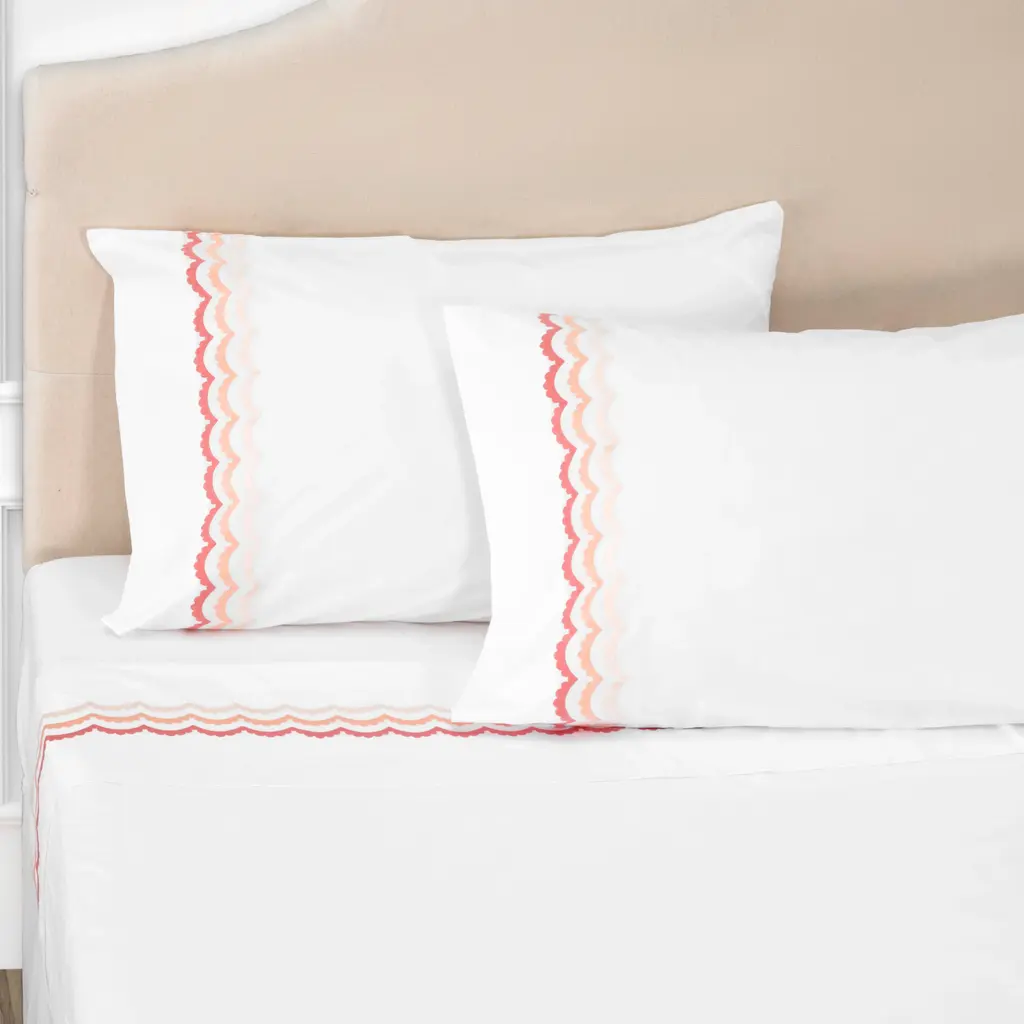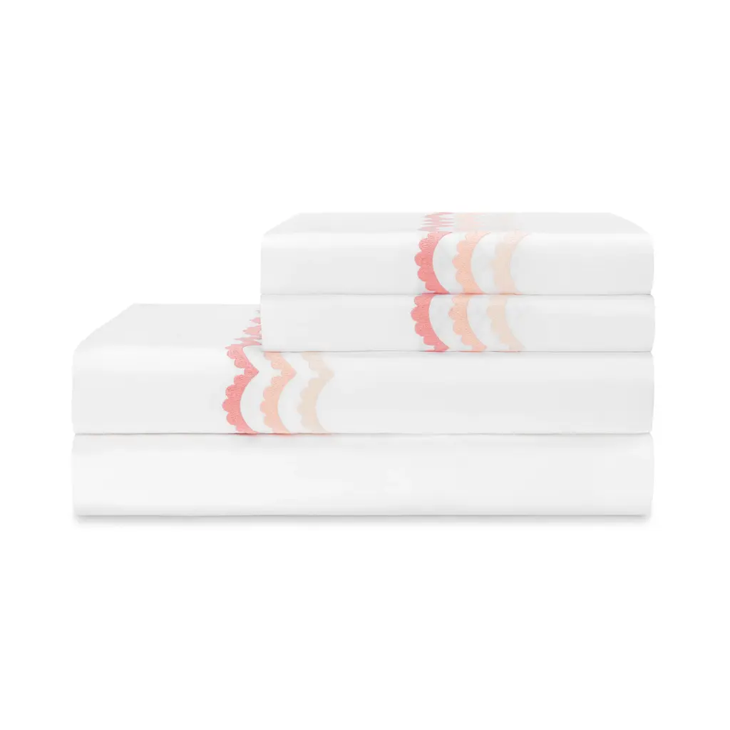 From renowned designer Celerie Kemble and luxury linen maker Hamburg House comes this exclusive Whimsical Scallop embroidered bedding and bath collection. Crisp long staple cotton percale sheeting is accentuated with a feminine scallop embroidery pattern that will add a fun yet sophisticated touch to any bedroom. Set includes flat sheet, fitted sheet, and 2 standard pillowcases Machine Wash Warm/Cold, Do Not Bleach, Dry on Medium Heat, Do not overdry, Iron on cotton setting as needed This bedding is made from the highest quality long-staple cotton - Celerie's personal favorite!