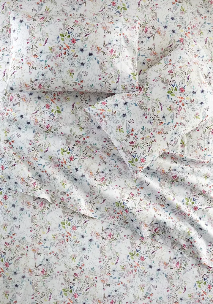 Sprigged with colorful wildflowers, Chloe creates an enchanting look for the bed. Crafted in Portugal of smooth, long-staple cotton percale, it’s lightweight, breathable and cool to the touch, making it an excellent choice for warm sleepers. The sheet set is designed to be mixed and matched with other products in the Chloe collection.