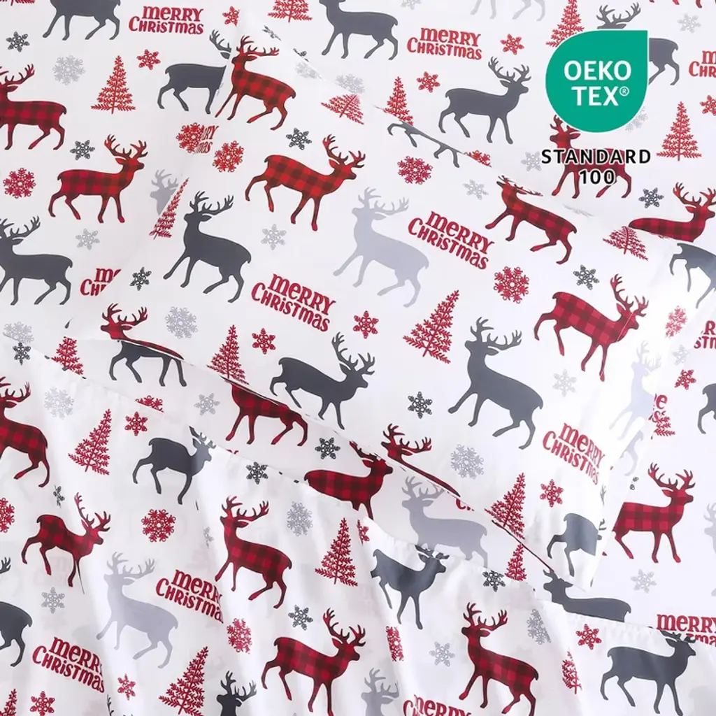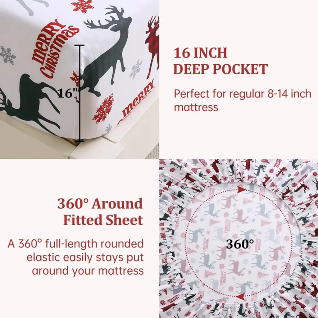 Christmas Bed Sheets King, 4 Piece Soft Brushed Microfiber Reindeer Print Bed Sheet Set - 16 Inch Deep Pocket, Easy To Fit, Wrinkle Free & Easy Care