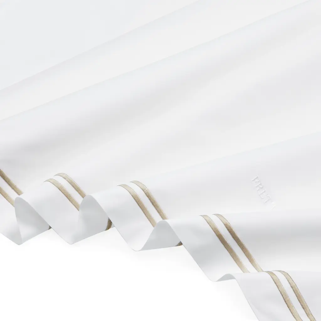 These luxurious Egyptian cotton percale sheets by Frette feature double rows of rich embroidery along the borders of the flat sheets and pillowcases for understated yet elegant touches of color.