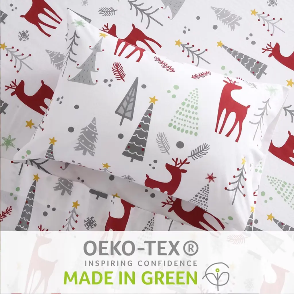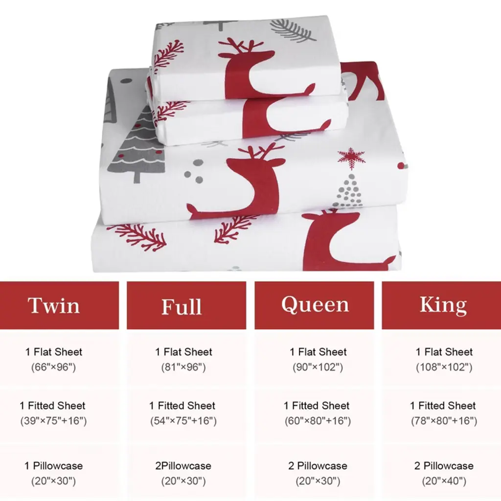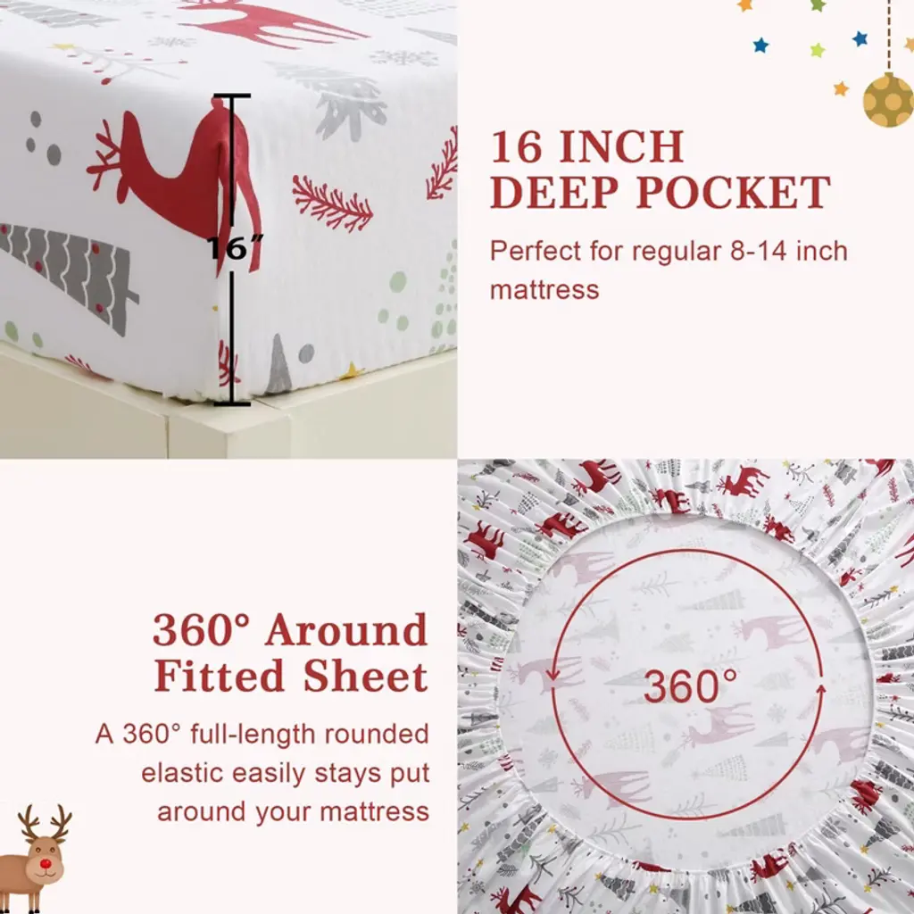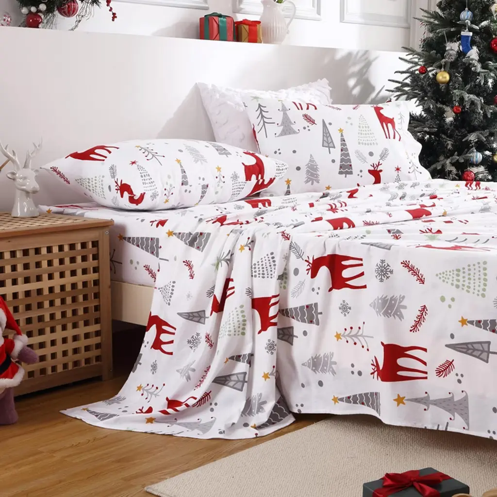 Add warmth and festive cheer to your bedroom with this cotton flannel Christmas bed sheet set, featuring charming Christmas tree, reindeer, and snowflake patterns. Made from ultra-soft and breathable cotton flannel, these sheets keep you cozy and comfortable all winter. The fitted sheet's deep 16-inch pocket and 360° elastic edge ensure a secure fit on most mattresses. Durable and easy to care for, this 4-piece set is the perfect winter holiday gift for yourself or loved ones.