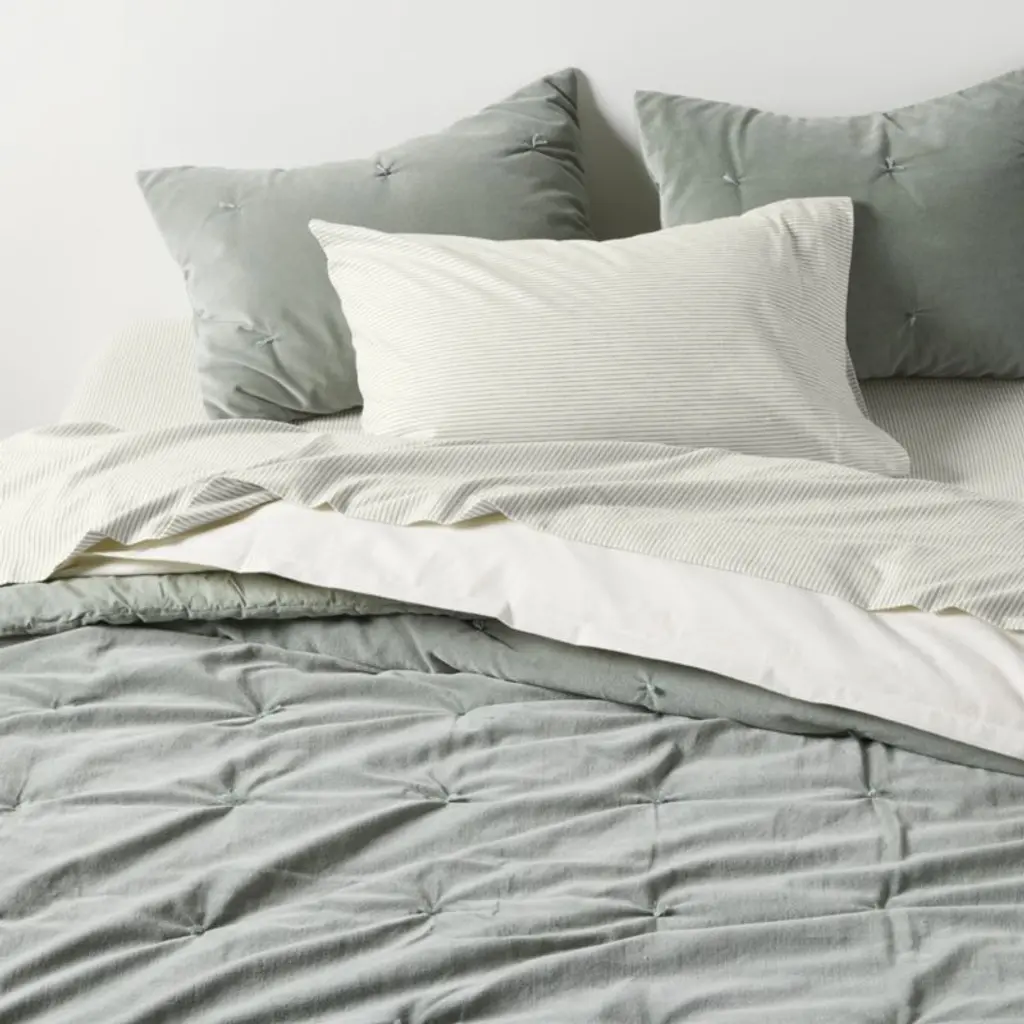 Dress your bed for winter in evergreen stripes on snowy off-white flannel. Softer than your favorite flannel shirtand just as casual-classicour Cozysoft collection makes an irresistibly cozy bed. Organic cotton weaves brushed flannel bedding that's supersoft with a touch of texture. Perfect for snuggling on chilly nights, the flannel sleeps extra-warm. Slender stripes in spruce green and ivory evoke well-tailored winter pajamas for a classic look. This charming sheet set layers with our solid-hued Cozysoft duvet covers, pillowcases and shams for a cold-weather or Christmas season look that's understated and inviting.Bed pillows also available.