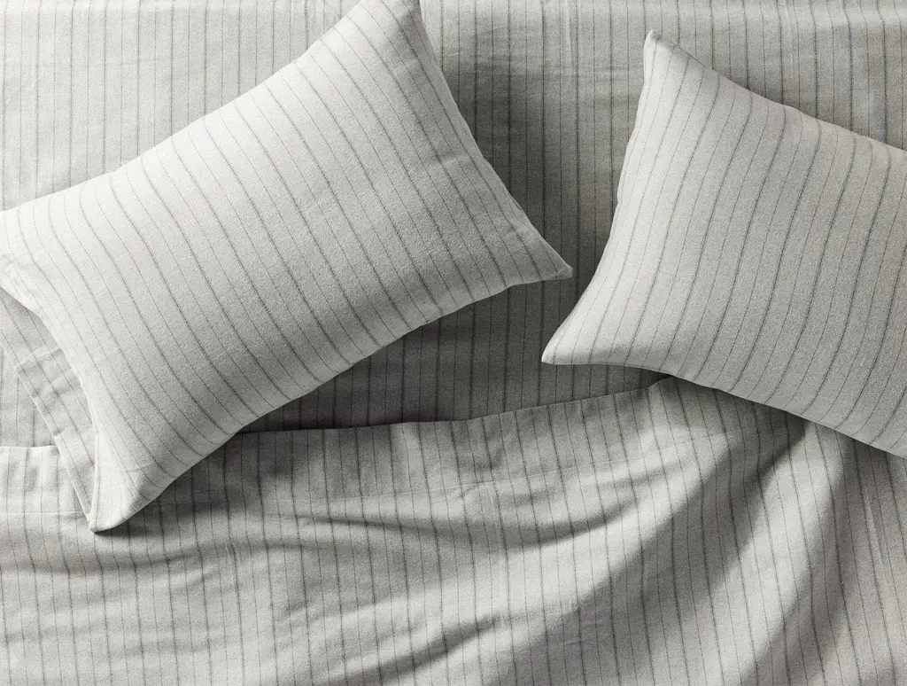 Dress your bed for winter in evergreen stripes on snowy off-white flannel. Softer than your favorite flannel shirtand just as casual-classicour Cozysoft collection makes an irresistibly cozy bed. Organic cotton weaves brushed flannel bedding that's supersoft with a touch of texture. Perfect for snuggling on chilly nights, the flannel sleeps extra-warm. Slender stripes in spruce green and ivory evoke well-tailored winter pajamas for a classic look. This charming sheet set layers with our solid-hued Cozysoft duvet covers, pillowcases and shams for a cold-weather or Christmas season look that's understated and inviting.Bed pillows also available.