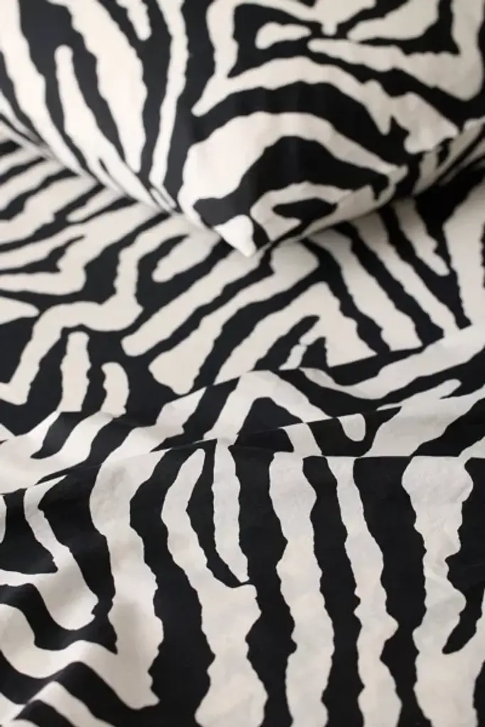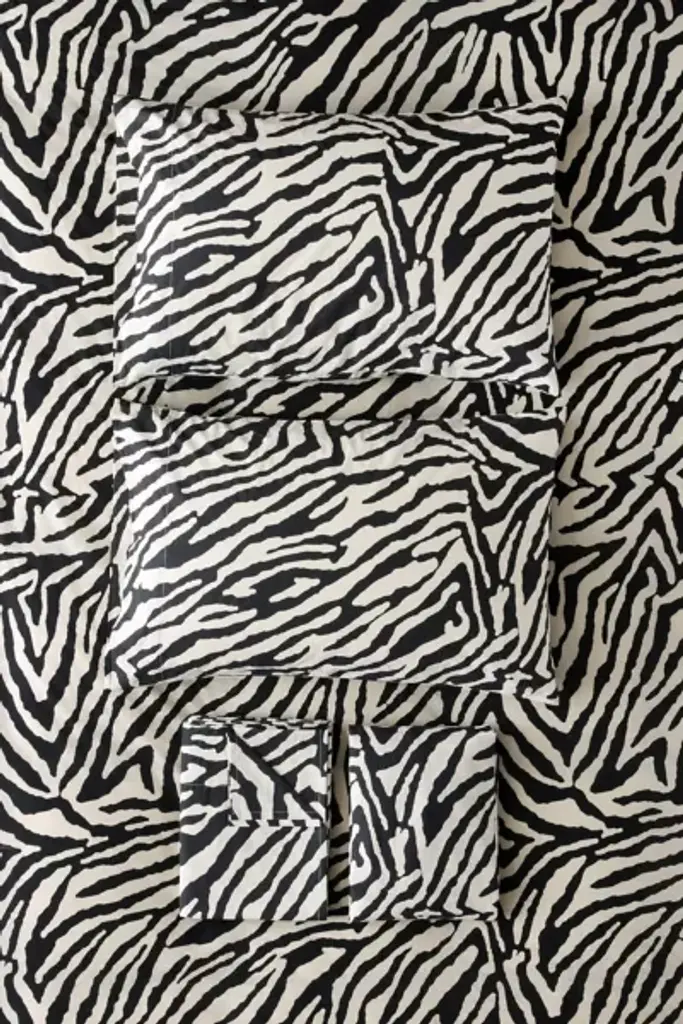 Make a bed for the bold with these zebra-printed bed sheets in our signature core cotton fabrication that gets softer after each wash. These animal print bed sheets come with everything you need to dress up your bed - a fitted sheet, flat sheet and pillowcases, too! Available exclusively at Urban Outfitters. **Features** \- Darcie Zebra Sheet Set from UO Home made in our core cotton fabrication \- Core cotton fabrication gets softer after each wash \- Bold bedding with an allover zebra print \- Includes all you need to make your bed: a flat sheet, fitted sheet and pillowcases \- An eco-friendly upgrade, this item is OEKO-TEX® Standard 100 certified free of harsh chemicals \- UO exclusive **Content + Care** \- Pillow inserts sold separately \- Twin XL sheet set includes pillowcase, flat sheet and fitted sheet \- Full, Queen and King sheet sets include 2 pillowcases, flat sheet and fitted sheet \- 100% Cotton \- OEKO-TEX® Standard 100 Certified \- Meets OEKO-TEX® Standard 100 guidelines which independently test each component for harmful substances for textiles you can trust \- Machine wash \- Imported **Size** Twin XL \- Pillowcase dimensions: 20"l x 30"w \- Flat sheet dimensions: 101"l x 66"w \- Fitted sheet dimensions: 80"l x 39"w x 15"h Full \- Pillowcase dimensions: 20"l x 30"w \- Flat sheet dimensions: 96"l x 81"w \- Fitted sheet dimensions: 75"l x 54"w x 15"h Queen \- Pillowcase dimensions: 20"l x 30"w \- Flat sheet dimensions: 102"l x 90"w \- Fitted sheet dimensions: 60"l x 80"w x 15"h King \- Pillowcase dimensions: 20"l x 36"w \- Flat sheet dimensions: 102"l x 108"w \- Fitted sheet dimensions: 78"l x 80"w x 15"h