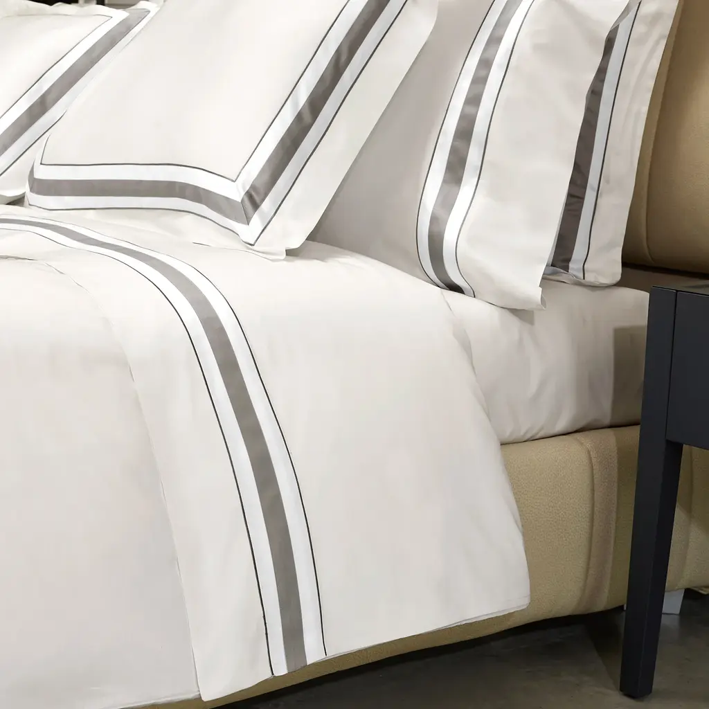 The Dimora Bedding Collection is made for those who love sensible luxury and clean lines. The color combination of applied borders and embroidered lines lends elegance and highlights the craftsmanship of these luxury Italian linens. *Sheets and pillowcases sold separately. Made in Italy of Sateen 300 t.c. using the finest and long-staple cotton threads.