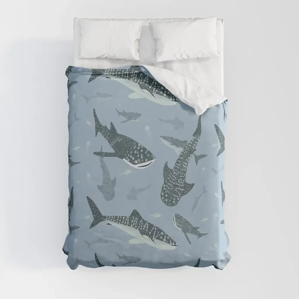 Sleep at your own risk and bring under-the-sea charm to any child's room! This ocean-inspired bedding set features friendly sharks in bright blue hues on a navy blue background. The comforter reverses to a light shade of blue with shark fins cruising along the seams. Your child will love the soft and breathable feel of microfiber, leaving them comfortable all night long. This bed in a bag set is machine washable for easy care. The twin includes 5 pieces and the full includes 7 pieces.