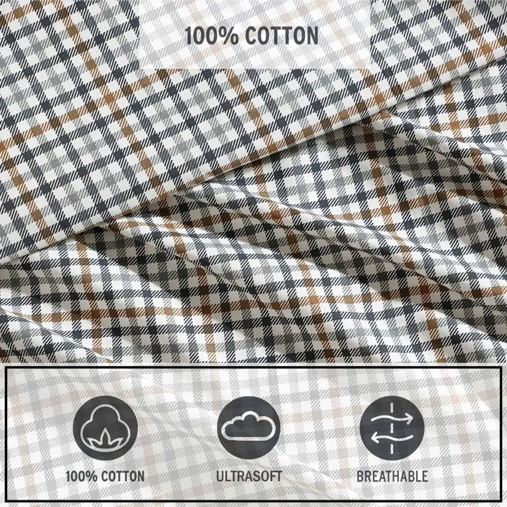 Eddie Bauer cotton percale sheet sets offer a smooth feel thanks to their single-ply percale weave, making them a lightweight and breathable choice for year-round comfort. Sheet sets are available in a wide variety of prints and patterns, offering something for every style. From classic plaids and outdoor motifs to subtle stripes and nature-inspired designs, there's a look to suit any bedroom décor. These distinctive patterns reflect Eddie Bauer’s signature blend of comfort and rugged charm. Designed with practicality in mind, the fitted sheets feature a 15" pocket depth (12" for twin size) and are capable of fitting mattresses up to 18" deep (15" for twin), ensuring a secure fit. Easy to care for, the entire set is machine washable, combining everyday convenience with Eddie Bauer’s signature quality.