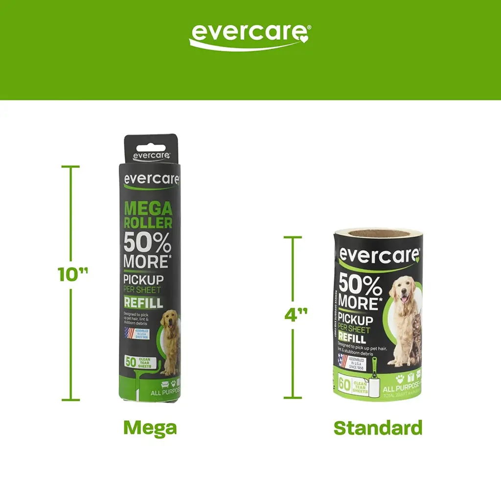 Evercare Ultra Sticky Pet Mega Lint Roller Value Pack with Lint Roller and 2 Refill Rolls, 50 Sheets Each,1 Pack - NewKeep your household and clothing fabrics clean and lint-free with the Evercare Ultra Sticky Pet Mega Lint Roller Value Pack. This convenient value pack includes a 50-sheet 10-inch ultra sticky pet mega lint roller and two 50-sheet refill rolls with extremely sticky adhesive lint sheets that quickly and efficiently remove unwanted lint, pet or human hair, and other debris from clothes, curtains, lampshades, couches, and other surfaces. The easy-tear sheets with precision razor cut edges pull off smoothly with no waste, allowing you to quickly reveal a fresh sheet as needed with a clean tear every time. Keep the lint rollers at home, in cars or offices, or bring them with you when you travel so you'll always have a convenient way to stay tidy. Ergonomically designed, the contoured grip handle fits in your hand securely for comfort and control during both quick touch-ups and larger heavy-duty cleaning projects, and it features an integrated hanging hole for easy storage.FEATURES:COLOR:OPERATION MODE:WHAT'S IN THE BOX:PACKAGING: Retail Packaging