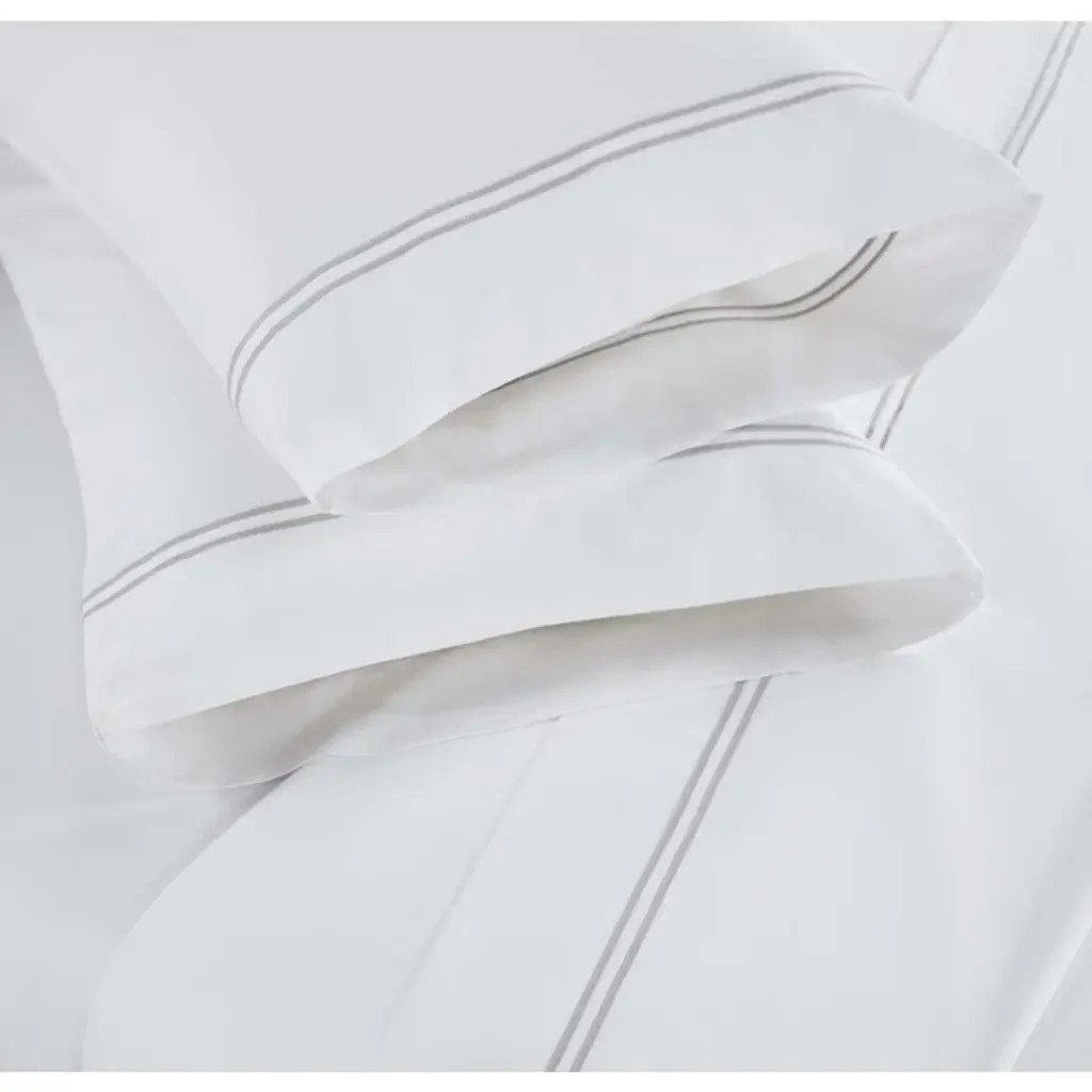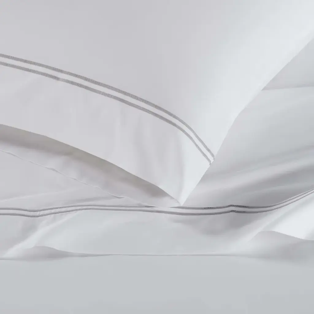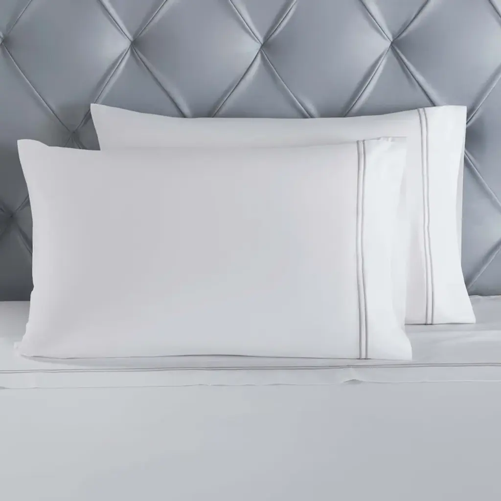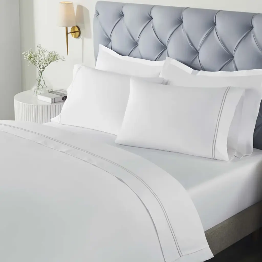 Bring modern style to your sleep space with our Cotton Two-Line Embroidered Sheet Set. Crafted from naturally soft cotton, this cozy sheet set is breathable, durable and long-lasting. This sheet set is available in a wide range of sizes to perfectly fit your bed, so your bedding looks pristine and luxurious. The all around elastic band on the deep pocket fitted sheet is designed to fit oversized mattresses or regular mattresses with a plush mattress topper up to 18 inches thick. Featuring an elegant two-line embroidery and finished with a subtle shimmer, this sheet set is a comfortable and luxurious addition to your bedding essentials.