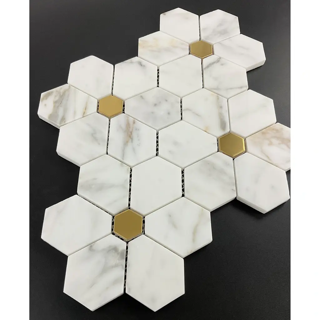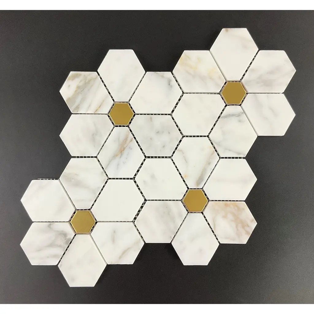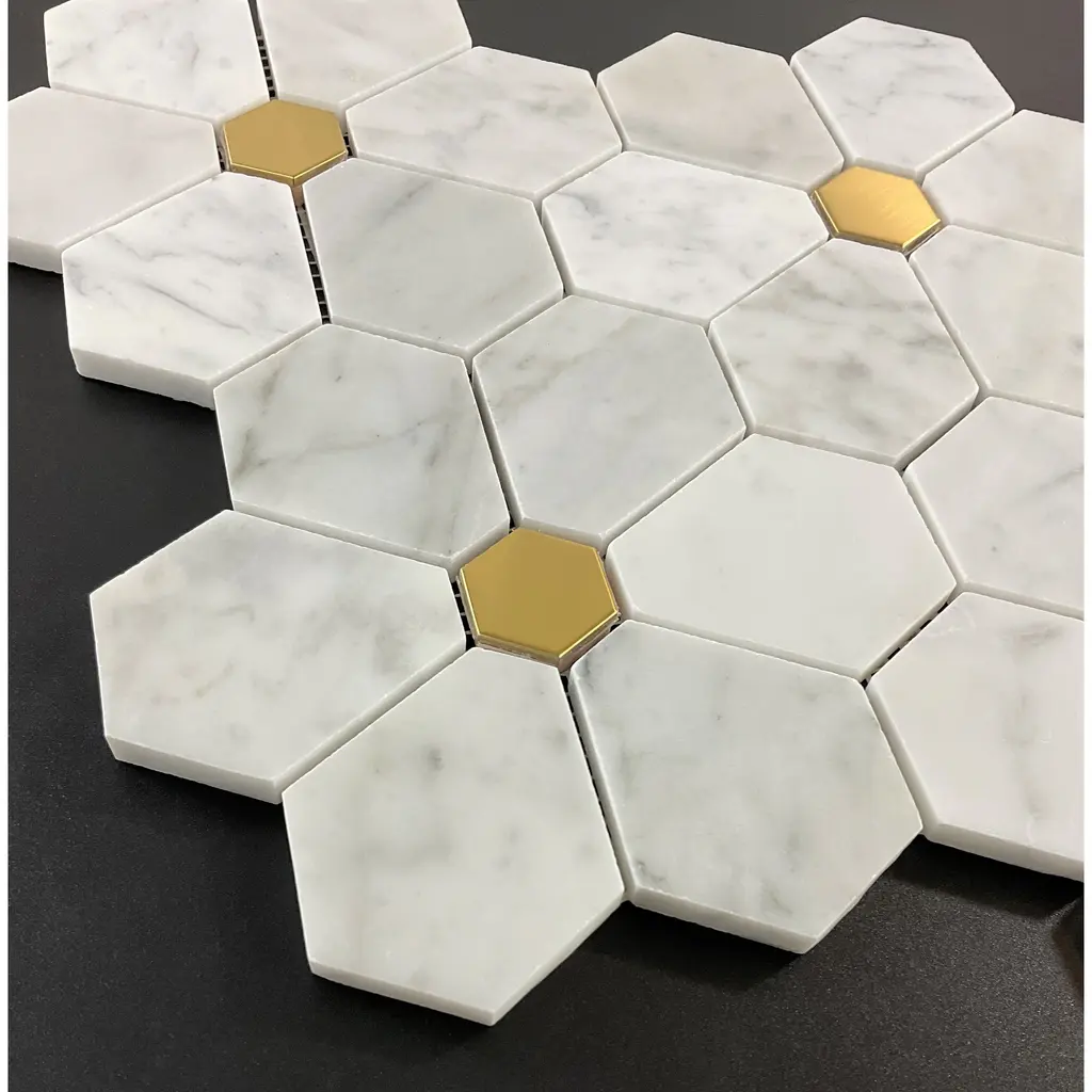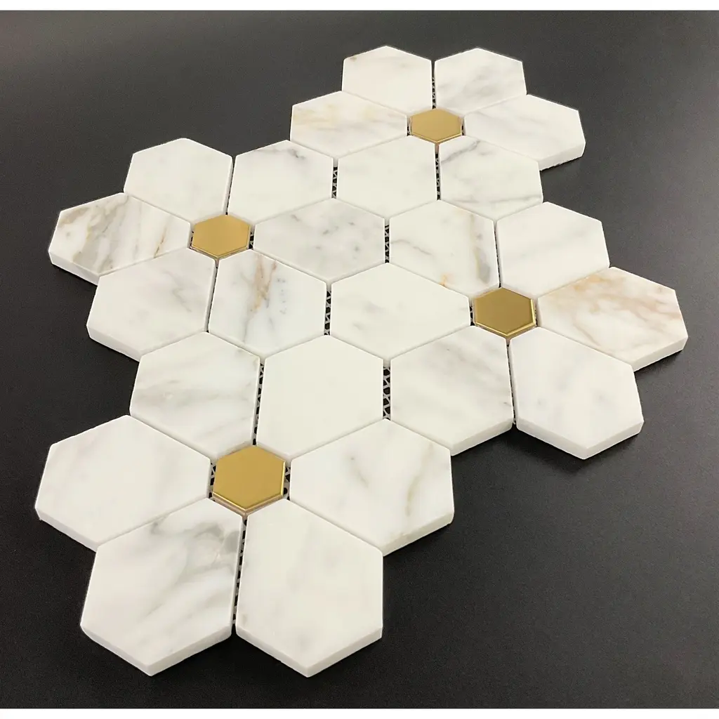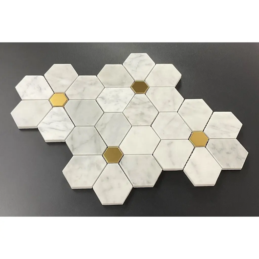 Color: 1. White Carrara & Gold Metal 2. Calacatta Gold & Gold Metal 3. Thassos White & Gold MetalPattern: FlowerMaterial: Natural Marble, Gold Stainless SteelDimensions Mosaic Sheet: 12.5'' W X 11.75'' L Individual Tile: Marble: 2.25 x 2.25, Metal: 1 x 1Overall Thickness: 0.31Surface Area per Carton: 8 SqFt (10 Sheets)Mesh-Mounted TilesInstallation Area: Kitchen Backsplash, Fireplace Front, Bathroom Wall, Shower Wall