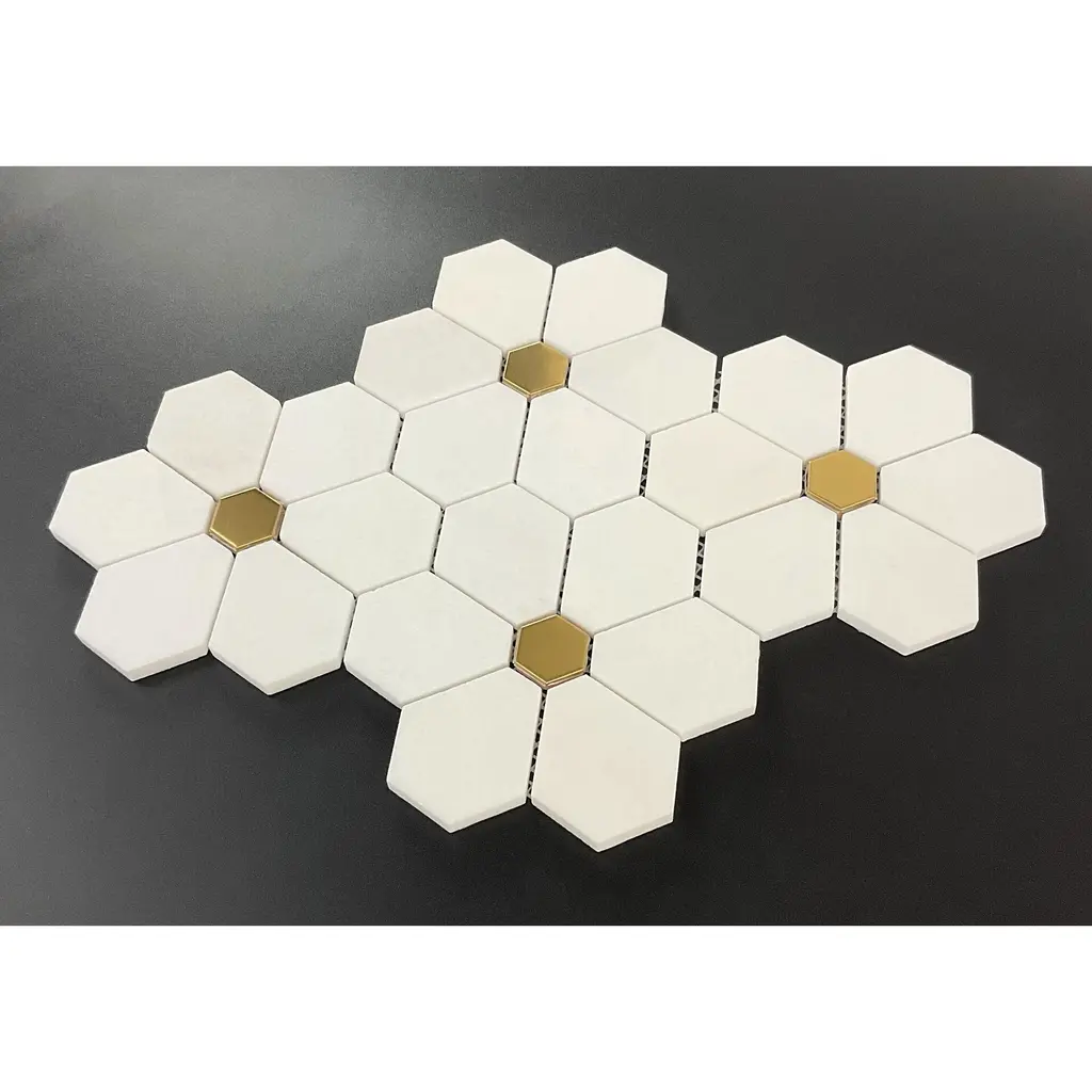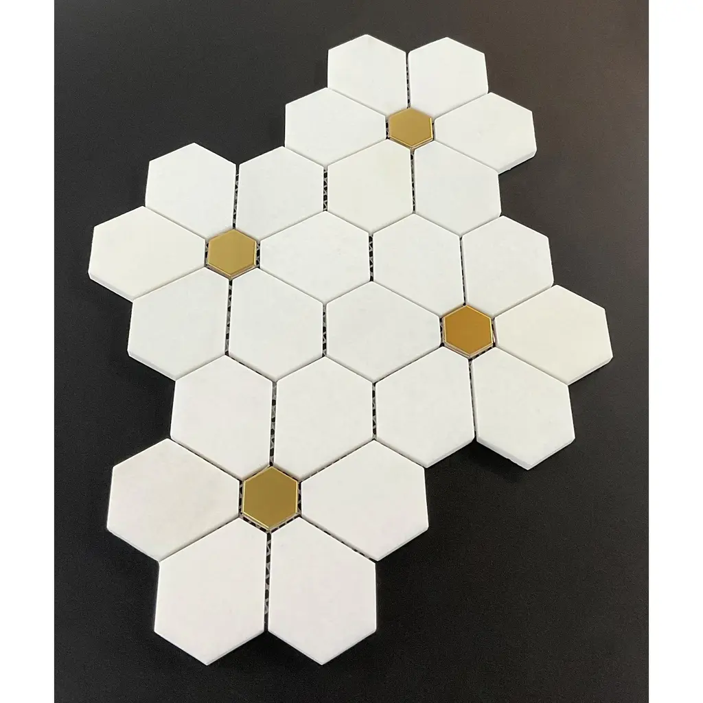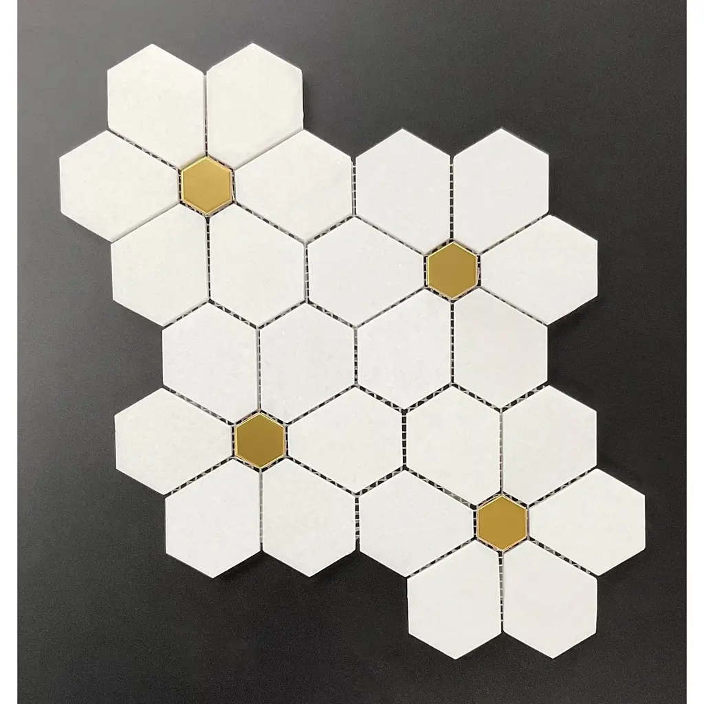 Flower Pattern Marble & Golde Metal Mosaic Tiles - Case (10 Sheets) - Thassos White - Gold