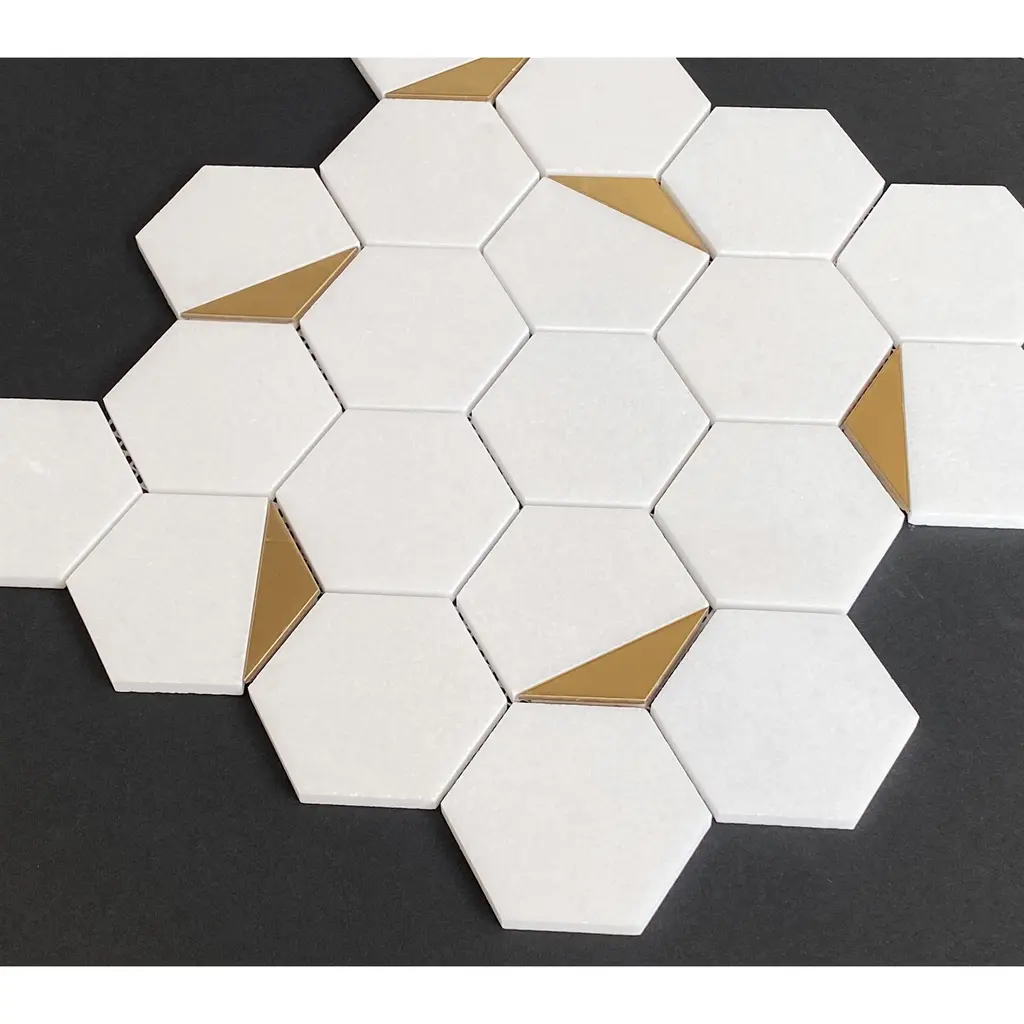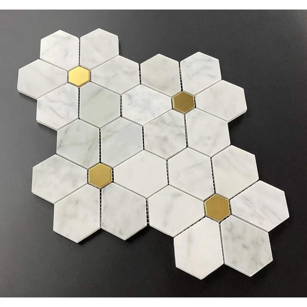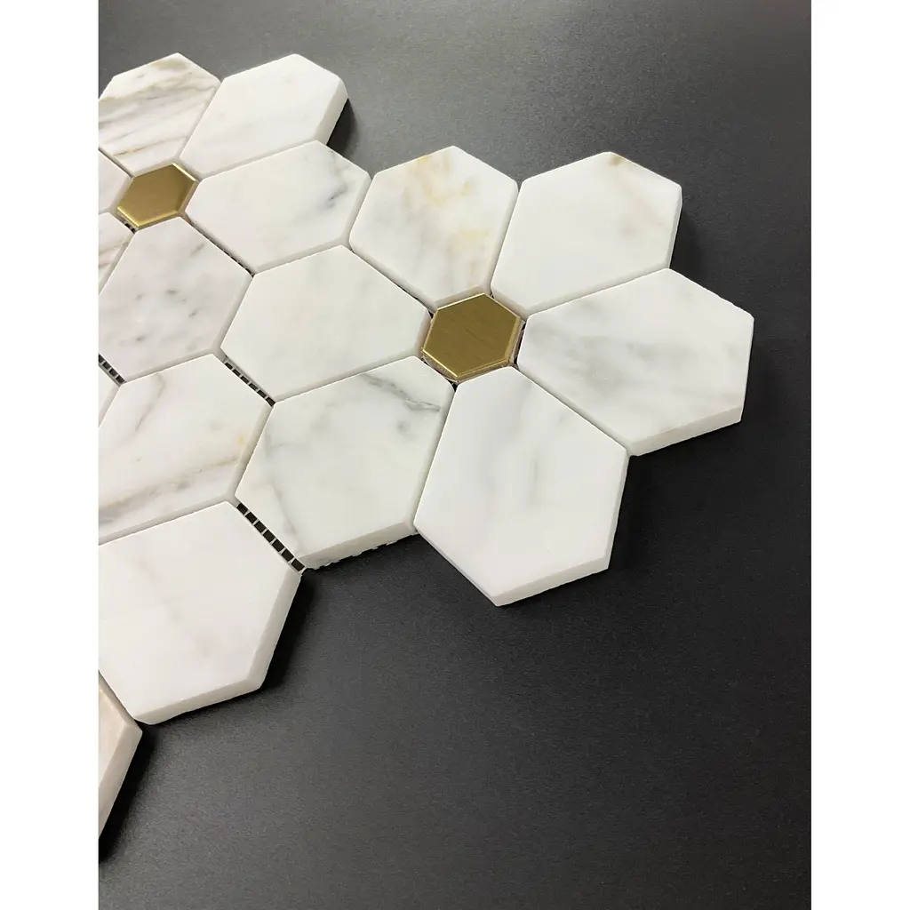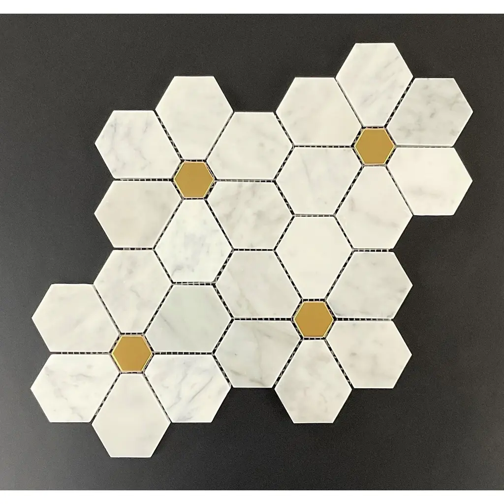 Flower Pattern Marble & Golde Metal Mosaic Tiles - Case (10 Sheets) - Thassos White - Gold