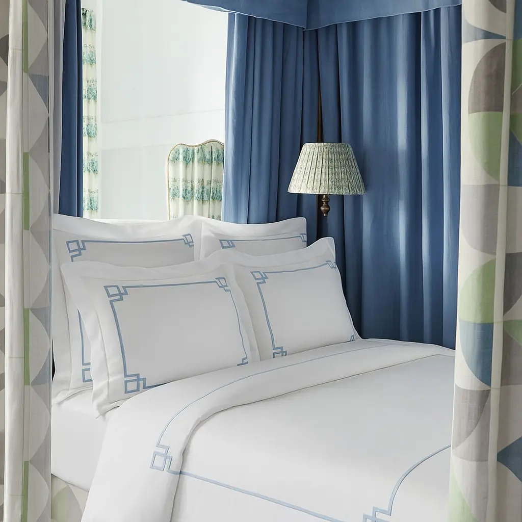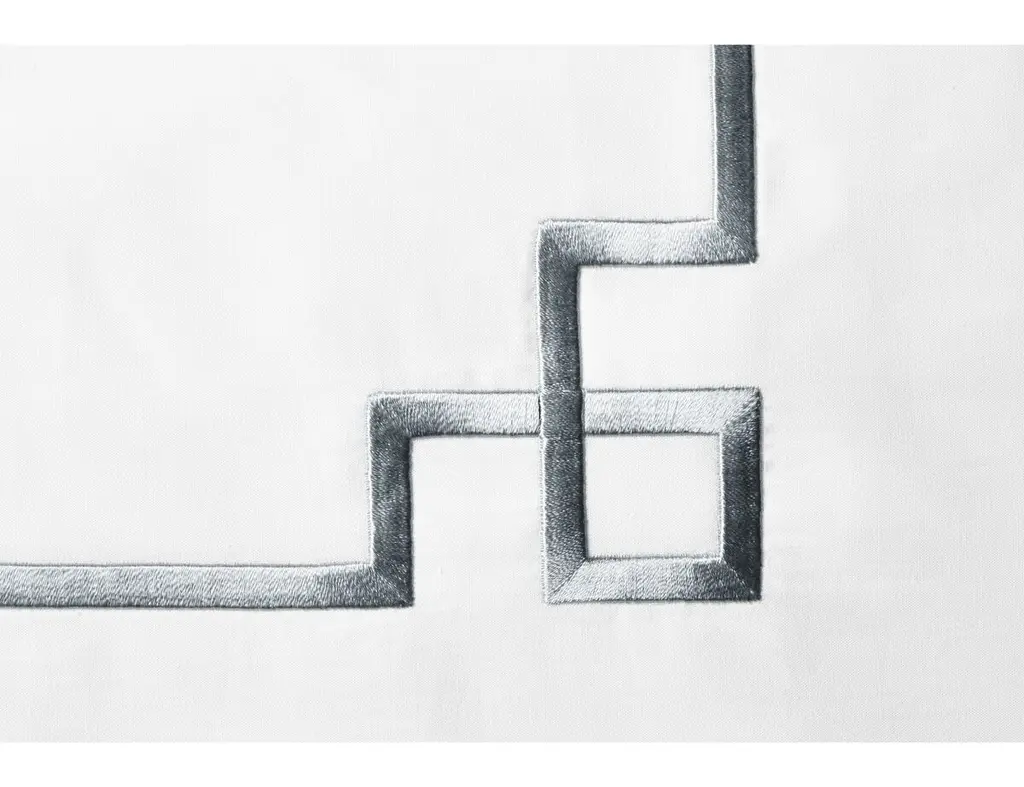 Intricately embroidered with fretwork details in light blue, this exquisite sheet set is made from the finest Pima cotton percale, woven in Italy and artfully embroidered in the USA. Fitted sheet not included.