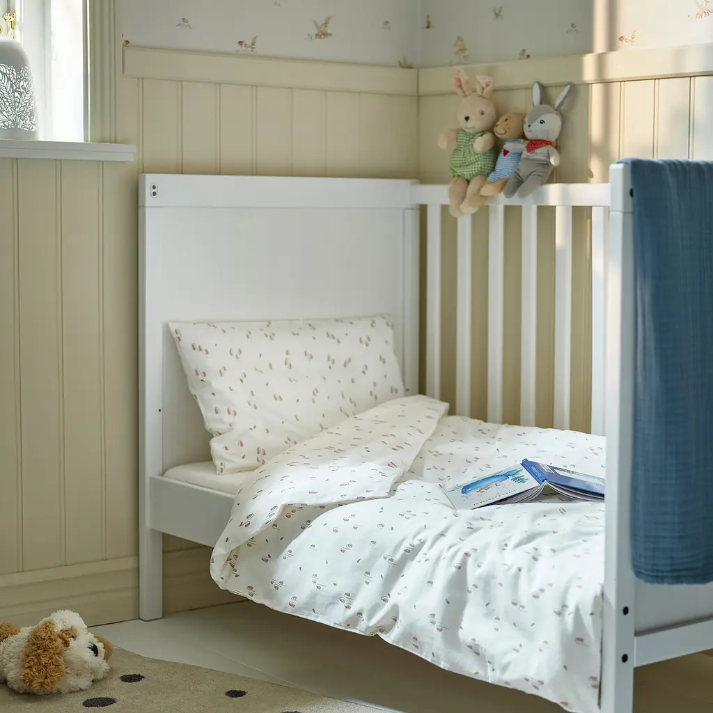 GULDVÄVARE Duvet cover 1 pillowcase f crib - white/floral pattern 43 1/4x49 1/4/13 3/4x21 5/8 ". Comprises of 100% organic cotton certified by GOTS - the Global Organic Textile Standard. Cotton is a soft and easy-care natural material that you can machine wash. The zipper keeps the duvet in place.