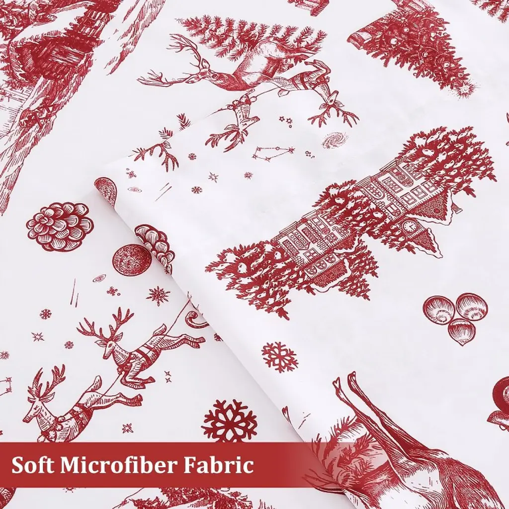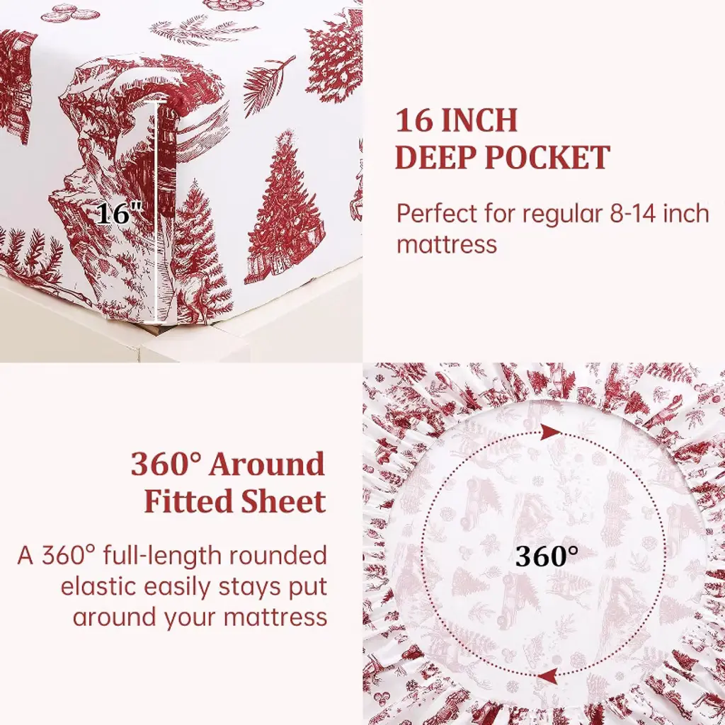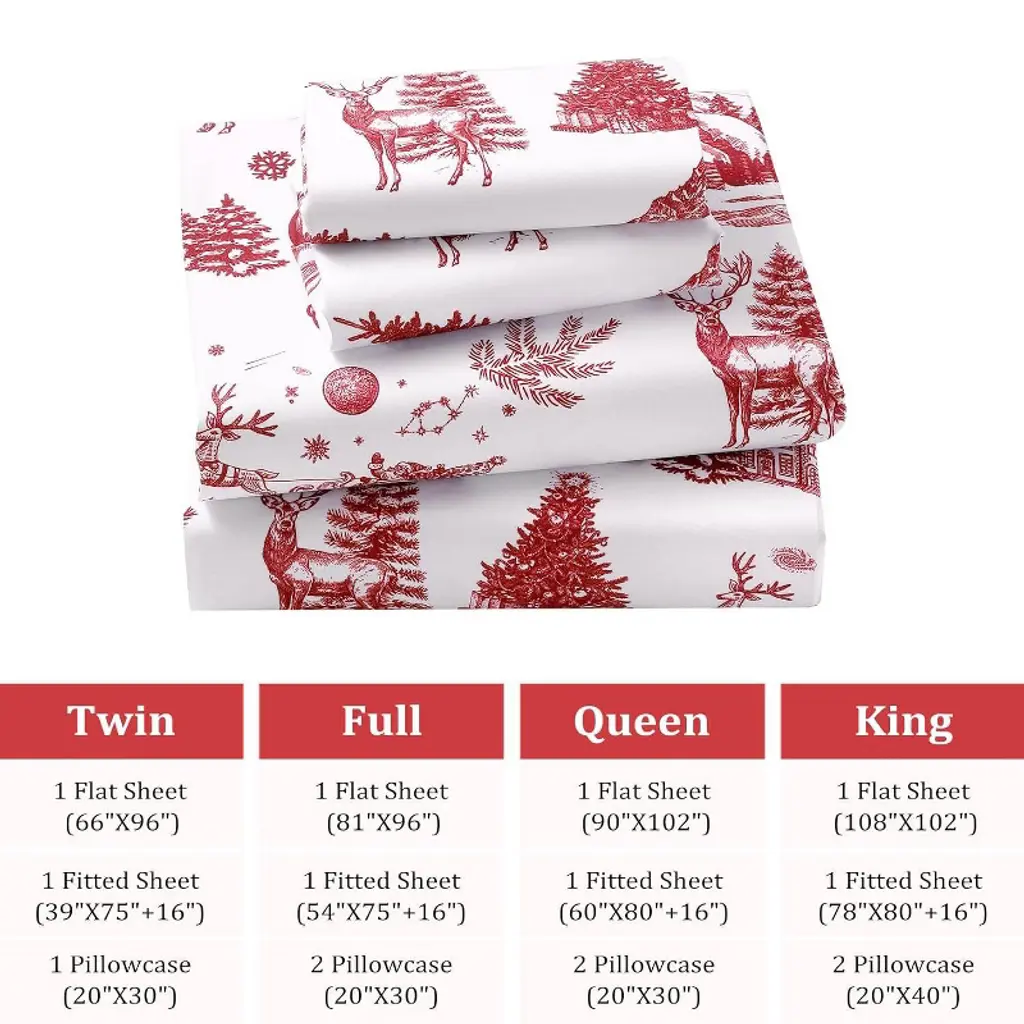 Experience ultimate comfort with Christmas sheet set. Featuring a festive reindeer pattern on a white background, it's perfect for holiday decorating or as a thoughtful gift. The fitted sheet has 16" deep pockets with a secure elastic band to stay in place on any mattress. The set includes one flat sheet, one fitted sheet, and two pillowcases. Maintenance is easy¡ªsimply machine wash cold and tumble dry low.