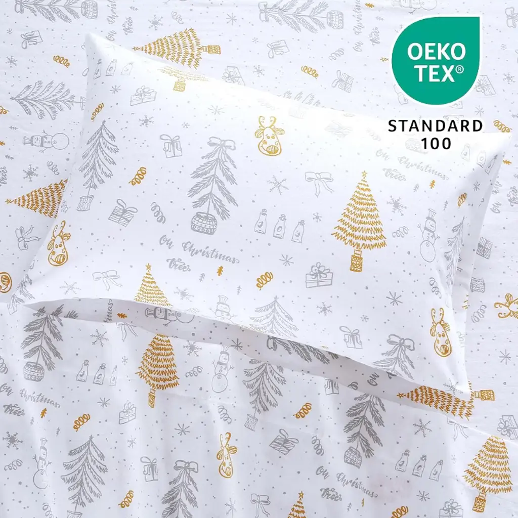 Embrace the holiday spirit with this king-size Christmas sheet set, featuring a charming deer and tree pattern on a white background. Crafted from 100% brushed microfiber, these sheets offer exceptional softness and breathability for a comfortable night's sleep. The fitted sheet features deep 16-inch pockets with an all-around elastic band to ensure a secure fit on your mattress. This set includes one flat sheet (108"x102"), one fitted sheet (78"x80"), and two standard pillowcases (20"x40"). Easy to care for - simply machine wash in cold water and tumble dry on low. Perfect as festive bedding or a thoughtful Christmas gift!