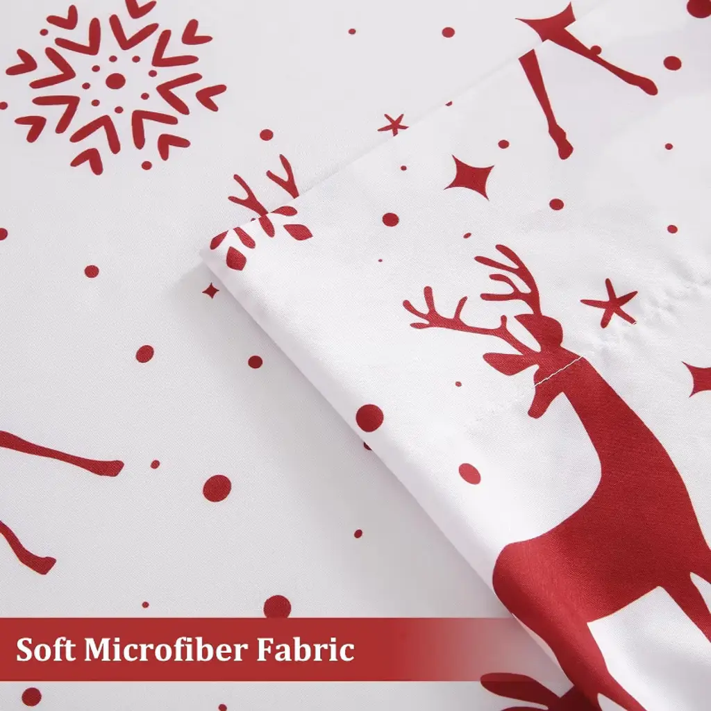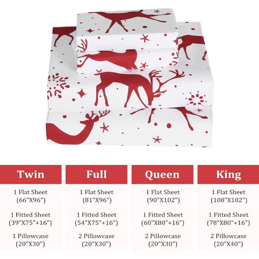 Celebrate the season with this king-size Christmas sheet set, featuring a festive reindeer pattern on a crisp white background. Crafted from 100% brushed microfiber, these sheets offer exceptional softness, warmth, and breathability for ultimate comfort. The fitted sheet features deep 16-inch pockets with a secure elastic band to stay firmly in place on your mattress. This complete set includes one flat sheet (108"x102"), one fitted sheet (78"x80"), and two standard pillowcases (20"x40"). Easy-care instructions: simply machine wash in cold water and tumble dry on low. Perfect as holiday decor or a thoughtful Christmas gift!