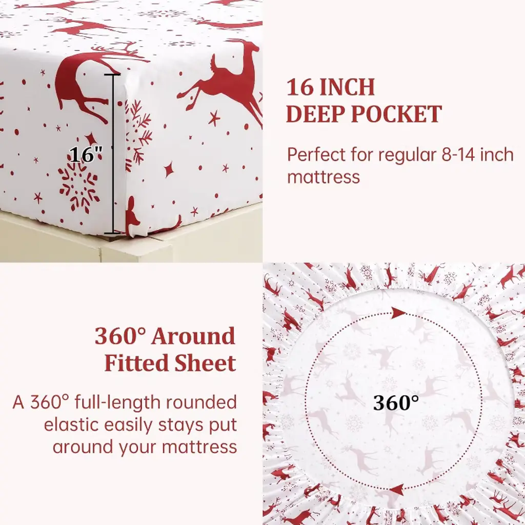 Gustowave King Size Christmas Soft Red Reindeer Holiday Bed Sheets Set With 16 Inches Deep Pocket