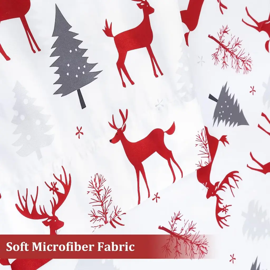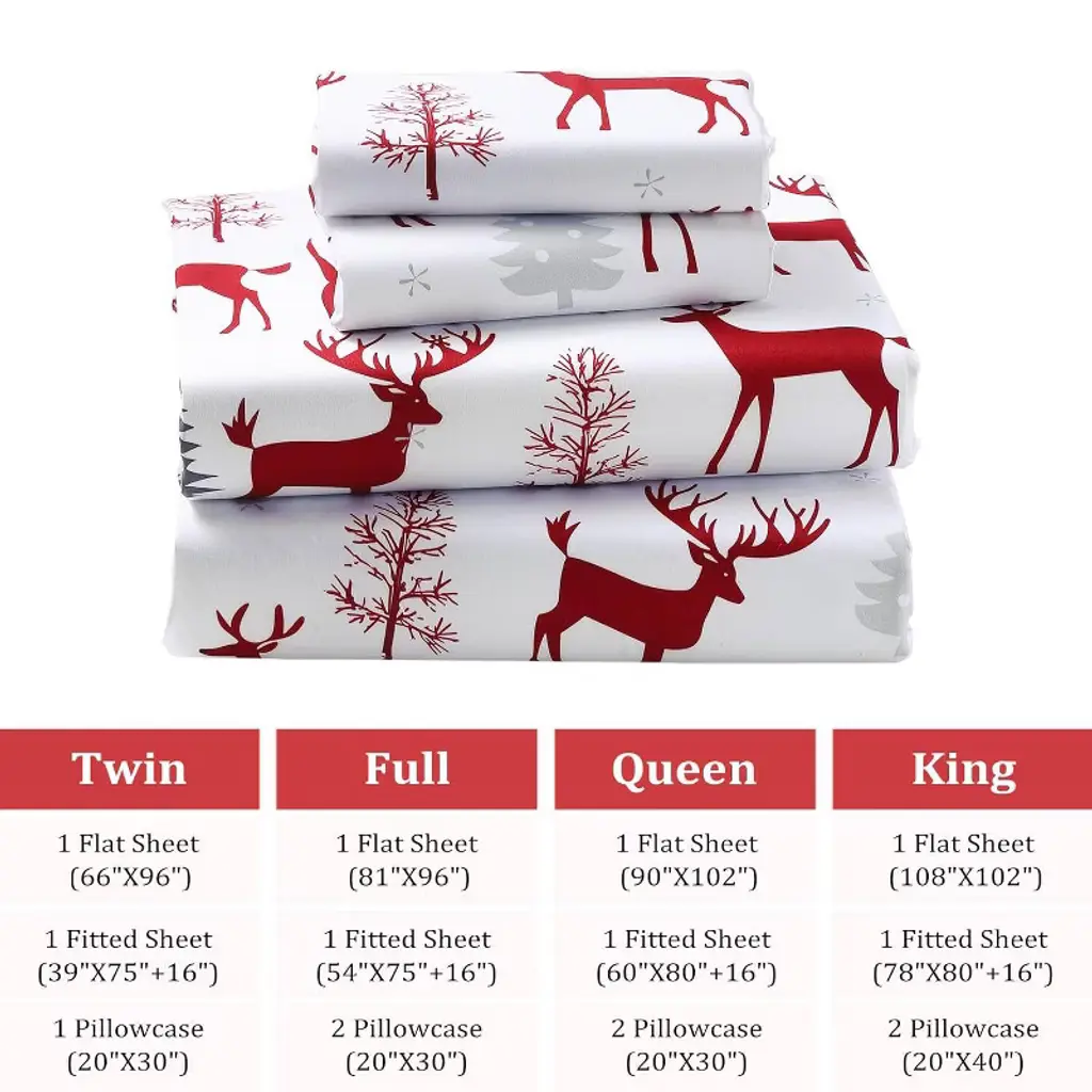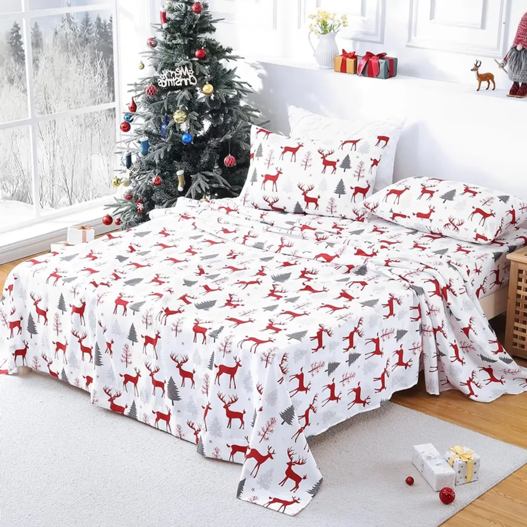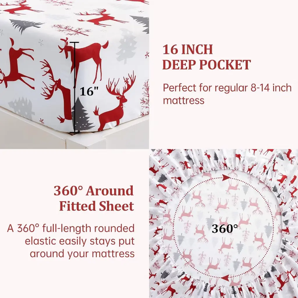 Experience ultimate comfort with Christmas sheet set. Featuring a festive reindeer pattern on a white background, it's perfect for holiday decorating or as a thoughtful gift. The fitted sheet has 16" deep pockets with a secure elastic band to stay in place on any mattress. The set includes one flat sheet, one fitted sheet, and two pillowcases. Maintenance is easy¡ªsimply machine wash cold and tumble dry low.
