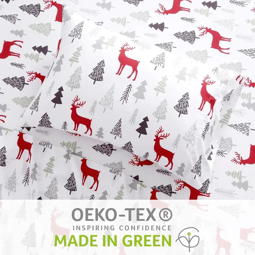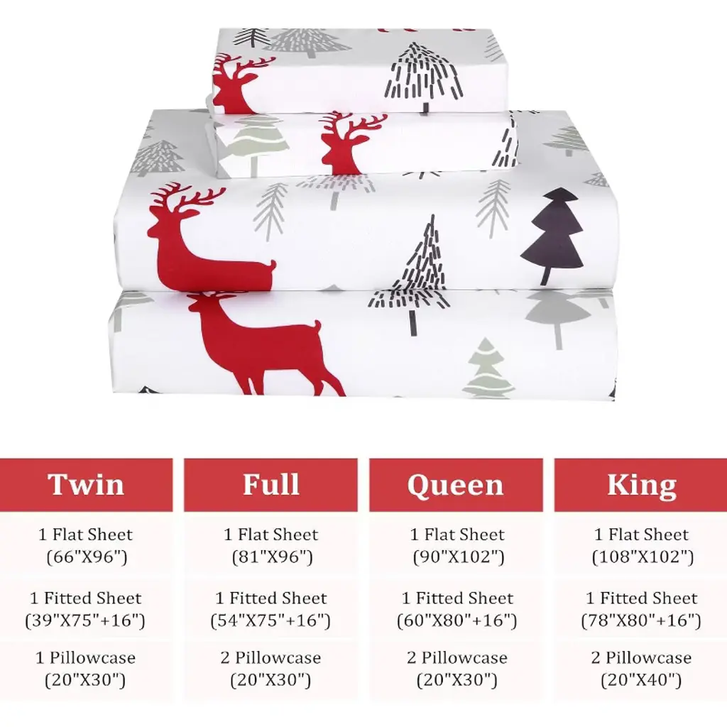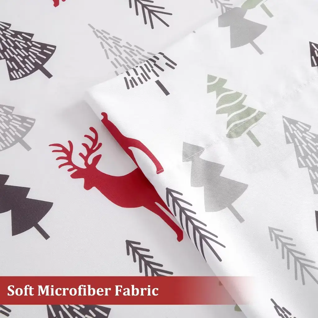 Experience ultimate comfort with this queen-size Christmas sheet set, crafted from 100% soft, brushed microfiber for a warm and breathable sleep. Featuring a festive reindeer pattern on a white background, it's perfect for holiday decorating or as a thoughtful gift. The fitted sheet has 16" deep pockets with a secure elastic band to stay in place on any mattress. The set includes one flat sheet, one fitted sheet, and two pillowcases. Maintenance is easy¡ªsimply machine wash cold and tumble dry low.