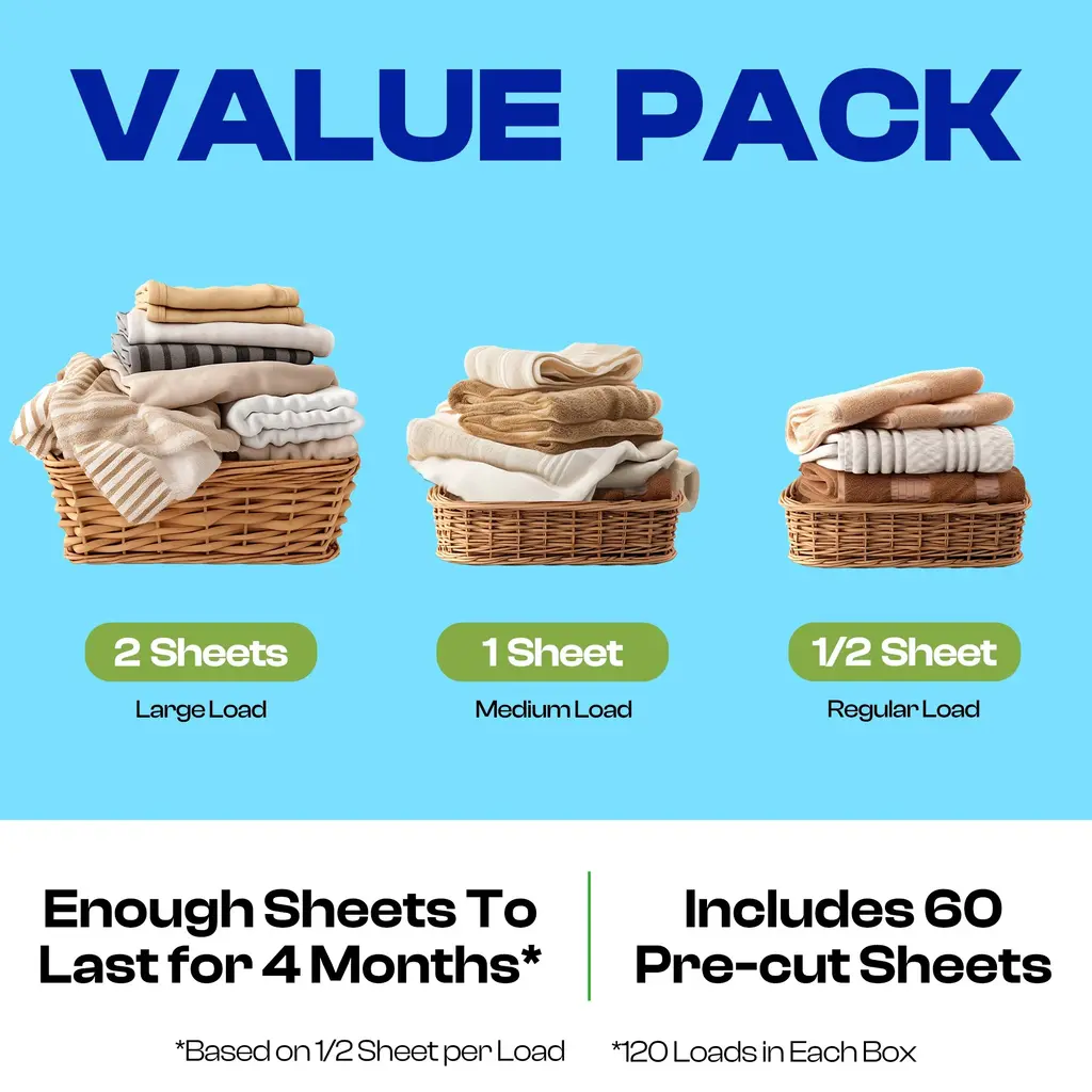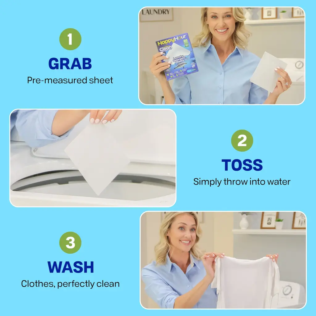 Experience the power of clean with Happy Hour Laundry Detergent Sheets. This 60-pack of pre-cut sheets designed to provide powerful cleaning for up to 120 loads offers a convenient and mess-free alternative to traditional liquid detergent—one sheet equals one cup of liquid! Designed to dissolve quickly in both hot and cold water, these laundry sheets are perfect for busy households looking to simplify laundry day without compromising on performance. Eco-friendly and hypoallergenic, the sheets are safe for all washing machines and tough on stains, odors, and dirt. Compact, lightweight, and free from harsh chemicals, they're ideal for home or travel. Make laundry easier, safer, and more sustainable with Happy Hour. Key Features Powerful Cleaning Formula: Each pre-measured sheet delivers concentrated cleaning power that dissolves fast and fights tough stains, odors, and dirt without the use of harsh chemicals. No Mess, No Waste: Skip the plastic jugs—our sheets are eco-friendly and come in a compact, reusable box that eliminates spills and clutter in your laundry area. Safe and Hypoallergenic: Formulated without harmful ingredients, these laundry sheets are gentle on sensitive skin and safe for babies, pets, and the planet. Works in All Machines: Compatible with all washing machines including HE models, and effective in both hot and cold water, for light or heavy loads. Eco-Conscious and Travel-Friendly: Lightweight and space-saving, these sheets are perfect for home use or packing on the go—no plastic containers, just clean laundry anytime, anywhere.