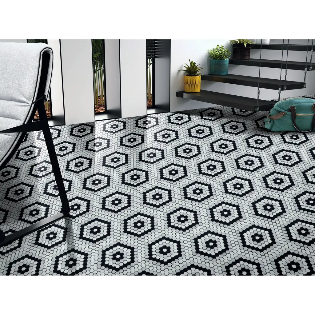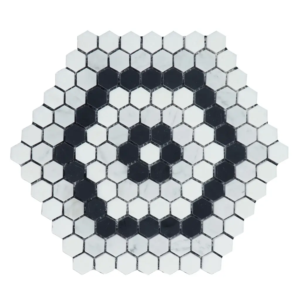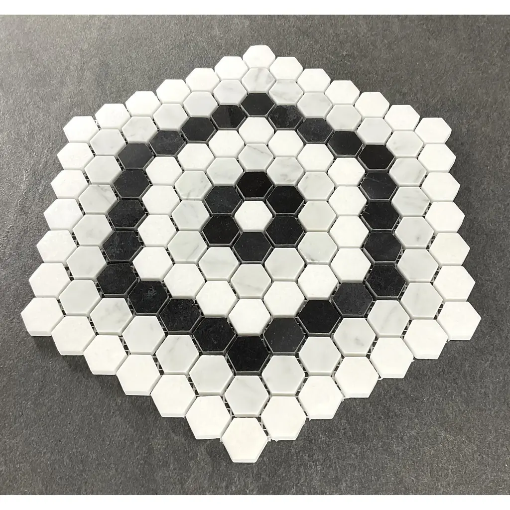 Material: Marble Style: HexagonColor: White Carrara, Thassos White and Black MarbleMosaic Sheet: 13'' W X 11.5'' L Individual Tile: 1" HexagonOverall Thickness: 0.32'' Overall Product Weight: 2.85 lb. Surface Area per Carton: 9 square feet Tile Type: Mosaic Sheet Tile Backing Type: Mesh Backed Floor Use: Yes Sold In Carton: Yes (10 Sheets) This is a natural marble mosaic tile. Regular stone sealing is required, and non-sanded grout must be used. Shade Variation: V1 Uniform Appearance Finish: Polished Recommended Grout Joint Size: 1/8 inches Mounting / Installation Location: Backsplash; Bathroom; Shower; Fireplace Surround; Wall; Floor