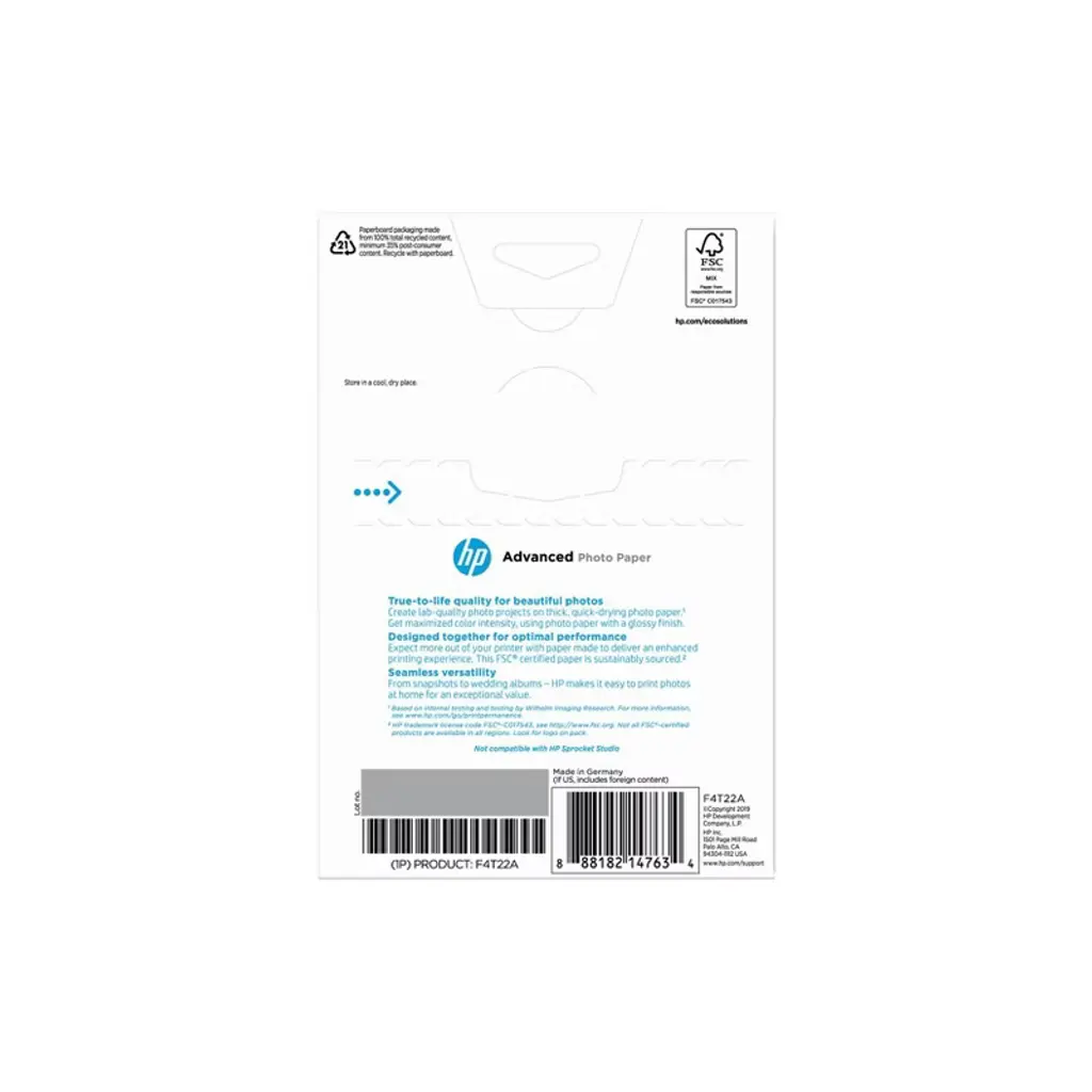 Overview - Print beautiful photos you'll love to hold and share. True-to-life photos feature rich, vivid colors and an impressive finish. Pass them around, right from the printer, without smearing or smudging. Enjoy decades of fade resistance. - HP Inkjet device owners - Print beautiful photos featuring rich, vivid colors that capture your memories with true-to-life accuracy. Handle your durable, lasting photos right from the printer. And print on paper designed with sustainability in mind. Features Print beautiful quick-dry photos - These beautiful photos feature rich, vivid colors that capture your memories with true-to-life accuracy. Designed with sustainability in mind - Help ensure that our forests are harvested sustainably by using FSC®-certified HP Advanced Photo Paper, Glossy. Count on durable, lasting photos - Handle quick-dry photos right from the printer. Disclaimers - See http://www.hp.com/go/printpermanence - HP trademark license code FSC®-C017543, see http://www. fsc.org . Not all FSC®-certified products are available in all regions, look for logo on pack. - HP Papers are recyclable in collections that accept mixed paper.