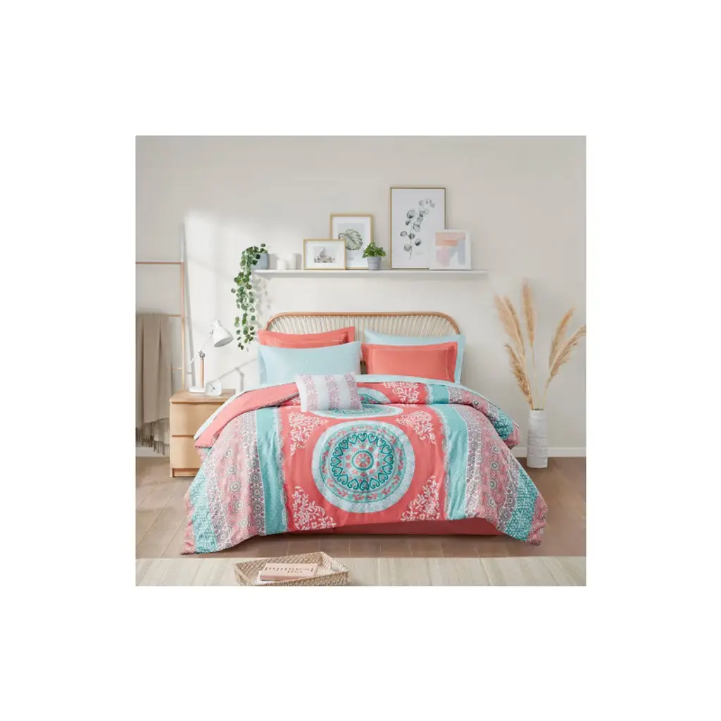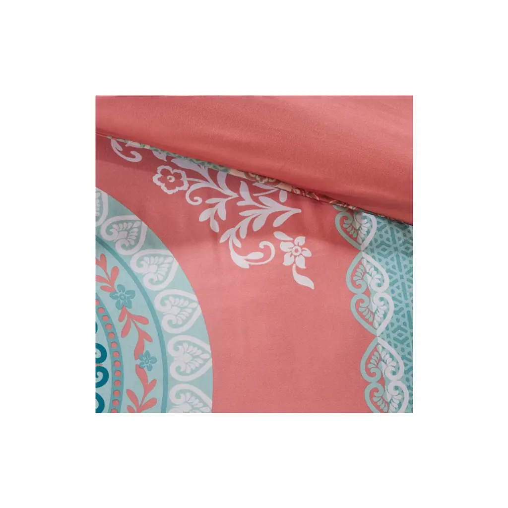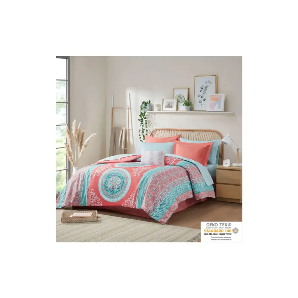 The quilt cover and bed sheet feature an elegant bohemian design with a vivid coral and aqua medallion print and sophisticated bohemian details, adding a bright and casual touch to your bedroom. The matching embroidered lace-edged pillowcases and decorative pleated pillows add a stylish touch, while the solid coral bed skirt completes the look. The bohemian vibe continues with the included full bed sheet set, creating a harmonious and unified design. This bedding set combines style and comfort, and is OEKO-TEX certified to ensure that it is free of harmful substances. It perfectly combines lively design and worry-free comfort to bring a comfortable experience to your living space.