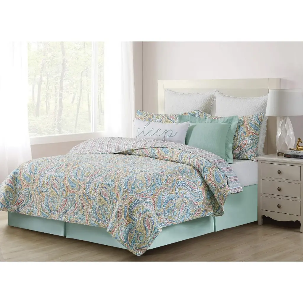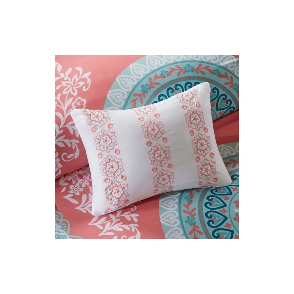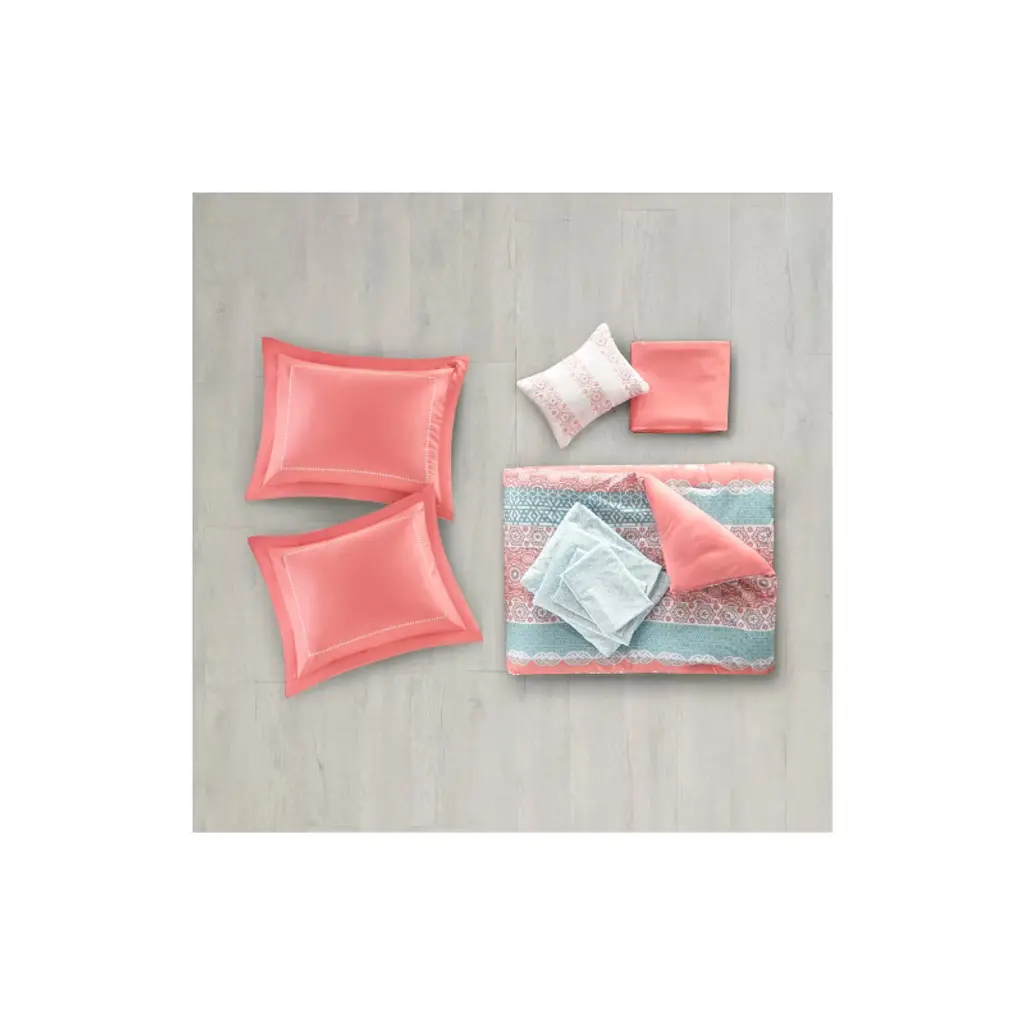 The quilt cover and bed sheet feature an elegant bohemian design with a vivid coral and aqua medallion print and sophisticated bohemian details, adding a bright and casual touch to your bedroom. The matching embroidered lace-edged pillowcases and decorative pleated pillows add a stylish touch, while the solid coral bed skirt completes the look. The bohemian vibe continues with the included full bed sheet set, creating a harmonious and unified design. This bedding set combines style and comfort, and is OEKO-TEX certified to ensure that it is free of harmful substances. It perfectly combines lively design and worry-free comfort to bring a comfortable experience to your living space.