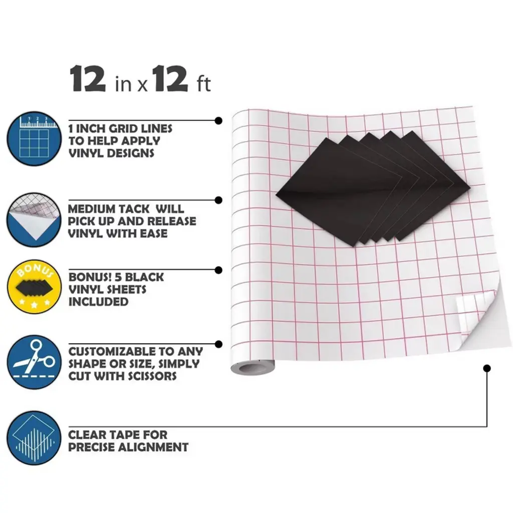 Kassa Transfer Tape Roll For Vinyl - Clear | 12 In X 12 Ft, 5 Black Vinyl Sheets Included | For Diy Art Projects