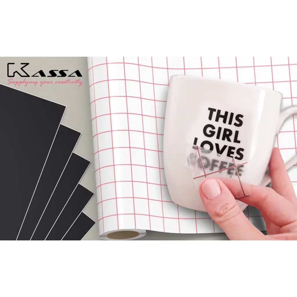 Meet your next crafting essential – Kassa Transfer Tape Roll for Vinyl. This easy-to-use, medium-tack adhesive tape roll is your key to endless personalization. Its impressively sized 12-inch by 12-feet dimension comes along with five handy black vinyl sheets offering diverse artistic opportunities. This transfer tape rolls out smoothly to easily imprint your unique vinyl designs onto any surface. The tape’s high-grade adhesive strength makes vinyl application a breeze, lifting and transferring designs flawlessly without leaving residue. Precision matters and Kassa Transfer Tape for Vinyl stands out with its 1-inch grid lines incorporated on the clear tape. This allows for meticulous alignment, making your vinyl application impeccable and error-free. Celebrate your creativity with Kassa Transfer Tape Roll for Vinyl. It's your ideal solution for DIY art projects, styling, and decorating your surroundings. Create standout wall arts, brilliant decals, or personalized gifts; the possibilities are boundless. Discover a streamlined process of vinyl application with the Kassa Transfer Tape Roll. It not only assists but empowers you to bring your creative vision to life with ease and precision. Explore an exciting world of creativity with Kassa Transfer Tape Roll for Vinyl.