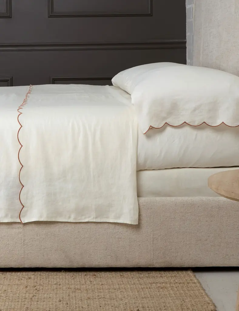 Pom Pom at Home offers superior linens and textiles made with the highest quality natural fibers for that relaxed, lived-in feel. The Kelly collection offers timeless bedding with a flourish, featuring delicately embroidered scalloping. With a matching trim on the top sheet and pillowcases, this sheet set drapes your bed with tailored charm.