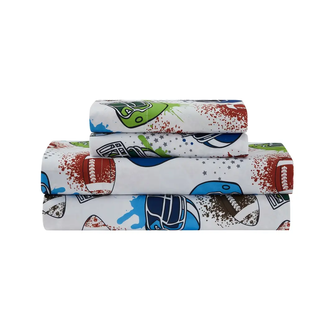 Your little ones can dream about making the game winning touchdown while sleeping in our Football themed Comforter and Sheet Set. Featuring a Green football field and blue helmet design and double brushed microfiber construction, they’ll love to sleep in this ultra soft comforter and sheet set. With the set you will get a 100% Polyester Microfiber & Down Alternative football print comforter with matching pillow shams, and a gorgeous white sheet set with footballs and helmets that will dress up your childs bed without breaking the bank. In ultra soft microfiber materials and gorgeous bold colors, this set is going to ensure your kids room is fashionably decorated.Comforter: Sheet Set: Sizes: Care Instructions: