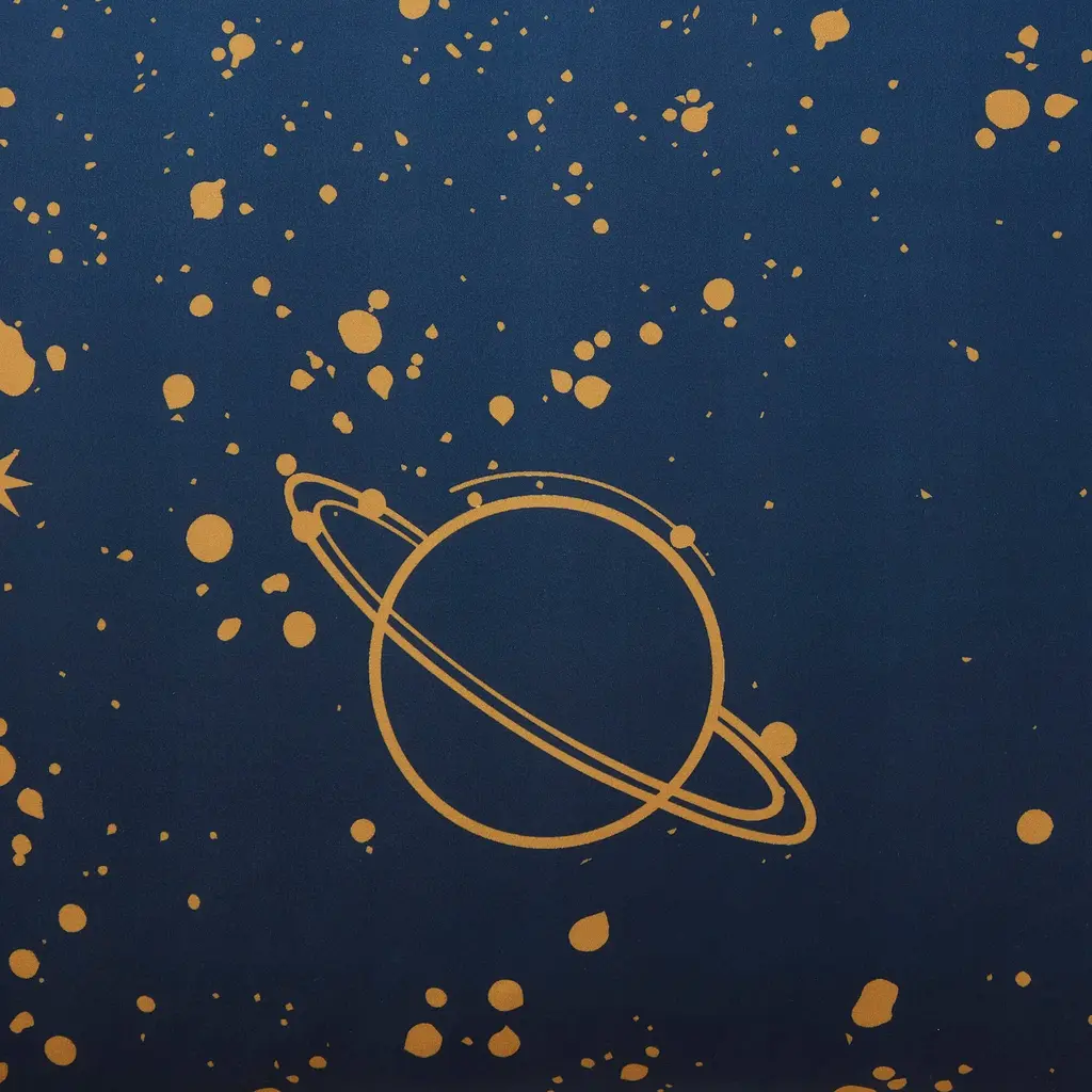 Our Galaxy Comforter and Sheet Set is out of this world! Blue fade comforter decorated with Gold colored stars, planets and constellations your little astronaut can dream about travelling to space with this 100% Polyester Microfiber & Down Alternative Comforter and Sheet set. With the set you will get a 100% Polyester Microfiber & Down Alternative Galaxy Space print comforter with matching pillow shams, and a gorgeous white print sheet set with blue and gold stars that will dress up your childs bed without breaking the bank.In ultra soft microfiber materials and gorgeous bold colors, this set is going to ensure your kids room is fashionably decorated.Comforter:Sheet Set: Sizes: Care Instructions:
