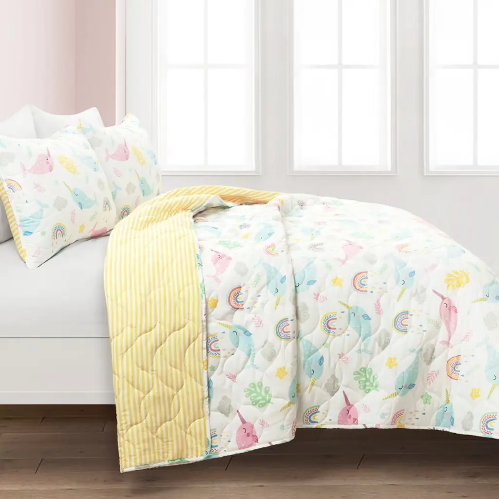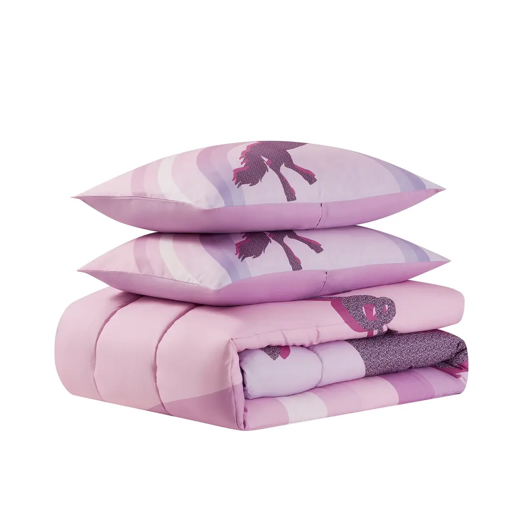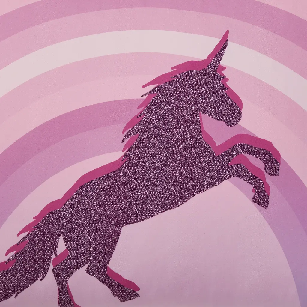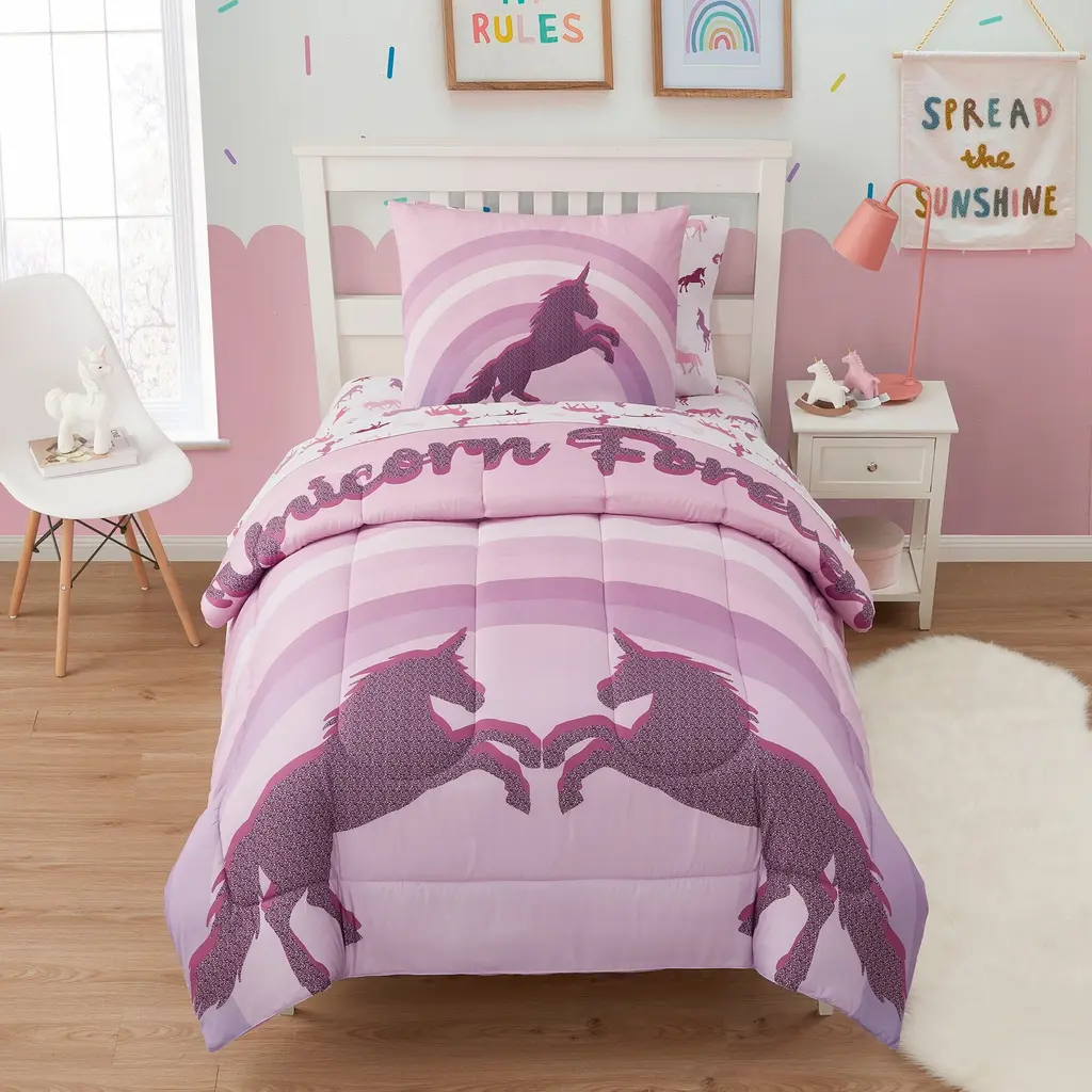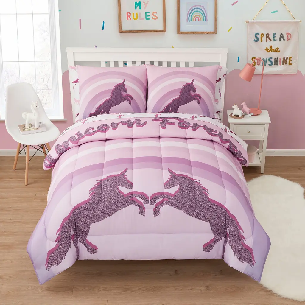 Add a touch of charm and enchantment to their sleep space with our Unicorn Forever ultra soft bedding. Decorated with rainbow Unicorns and stars on a pink background, your child will love this 100% Polyester Microfiber & Down Alternative Comforter and Sheet set. With the set you will get a 100% Polyester Microfiber & Down Alternative Purple Unicorn print comforter with matching pillow shams, and a matching white sheet set adorned with unicorns in purple and pink shades that will dress up your childs bed without breaking the bank. In ultra soft microfiber materials and gorgeous colors, this set is going to ensure your kids room is fashionably decorated.Comforter: Sheet Set: Sizes: Care Instructions:
