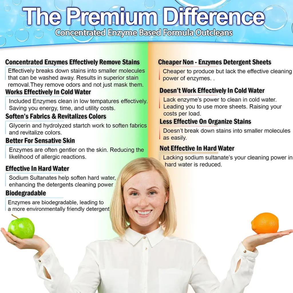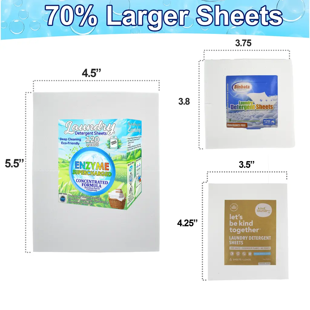 ECO-FRIENDLY, ALLERGY-SAFE LAUNDRY DETERGENT SHEETS: Harness the efficiency of our eco laundry detergent sheets infused with the natural cleaning of plant-based ingredients. Biodegradable and enzyme based to avoid use of harsh chemicals. These laundry detergent sheets offers a green laundry detergent alternative. They are hypoallergenic and dissolve quickly, completely, and effectively in both cold and hot water, ensuring your clothes are not just clean but also fresh. 13 AVAILABLE SCENTS : Fresh Scent: Experience the essence of sun-drenched linens with our Fresh Scent. Lavender Tranquility: Immerse your laundry in the calming, floral embrace of Lavender. Irish Spring : Revitalize your fabrics with the brisk freshness of Irish Spring. Meadow Breeze Freshness: Awaken your senses with Meadow Breeze. Spring Blossom Aroma: Usher in the vibrancy of spring with our Spring Blossom scent, blending the freshness of flax with the subtlety of early bloom florals. Rose Petal Elegance: Envelope your clothes in the luxurious blend of blooming peonies and delicate rose petals. Unscented & Pure: Opt for simplicity with our Scent Free option. Ideal for sensitive skin, these sheets offer effective cleaning with enzyme power. Sheets have a mild smell due to the Enzymes but they have no added fragrances.Ocean Breeze: Experience the refreshing scent of Ocean Breeze with notes of seawater, oranges, and lavender. Venus Blossom: Indulge in the enchanting fragrance of Venus Blossom, where lemon, jasmine, and sandalwood create a sophisticated, floral aroma. Coconut Blossom: Embrace the tropical allure of Coconut Blossom, blending citrus, jasmine, and vetiver for a warm and exotic fragrance. Spring Breeze: Enjoy the crisp and invigorating scent of Spring Breeze, featuring apple, jasmine, and cedar for a fresh and uplifting experience. Modern Gent: Discover the refined elegance of Modern Gent Cologne, combining lemon, jasmine, and amber for a distinguished, masculine fragrance. T-Shirt: Relish the clean and breezy aroma of T-Shirt, with notes of lemon, lavender, and vetiver, perfect for a freshly laundered feel SUPER CONCENTRATED ENZYME ENRICHED STAIN FIGHTING : Fortified with natural enzymes, our detergent sheets deliver superior cleaning performance, even on stubborn stains. They effectively break down dirt, grease, grass stains and odors, leaving your clothes fresh and spotless with each wash. Each enzymatic laundry detergent is hypoallergenic and enzyme-based cleansing perfect for sensitive skin and baby clothes. Normal detergents can have up to 90% water Eliminate the waste and switch to these concentrated & mess free detergent sheets. 70% LARGER SHEETS - MONEY SAVING CLEANING SOLUTION : Measuring 4.5" x 5.5" these sheets are up to 70% larger than other brands. Its 70% larger than Binbata sheets (3 3/4" x 3 7/8"), 66% larger than Kind Laundry sheets (3.5" x 4.20") and 6% bigger than Earth Breeze sheets (4.4" x 4.25"). EFFORTLESS PRE-MEASURED MESS-FREE OPERATION: Simplify your laundry routine with our pre-measured, mess-free laundry washer sheets. No need for measuring cups or fear of spills. FOR ALL WASHING MACHINES, FABRICS, & WATER TEMPATURES - EVEN CARPET CLEANERS : Engineered for compatibility, these detergent sheets deliver impeccable results. From hot and cold water, from standard to HE machines, from everyday garments to specialized delicate fabrics. It's also a great baby detergent.