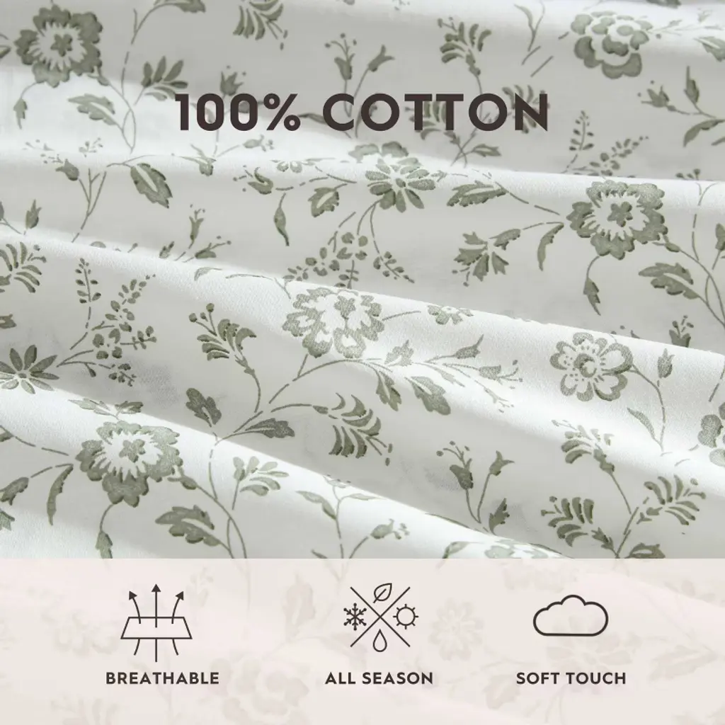 Laura Ashley printed percale sheet sets bring a charming, romantic touch to your bedroom with timeless floral designs in beautiful color palettes. Perfect for mixing and matching with Laura Ashley comforters, duvet covers, or quilts, these sheets effortlessly add a hint of color. Crafted from breathable, lightweight cotton, they are cool to the touch and become softer with each wash for long-lasting comfort. The fully elasticized fitted sheet ensures a secure fit, accommodating mattresses up to 18" deep for queen and king (16" for twin, 17" for full). Each machine washable set includes one flat sheet, one fitted sheet, and two pillowcases (one for twin and twin xl sizes) for a perfectly polished look.
