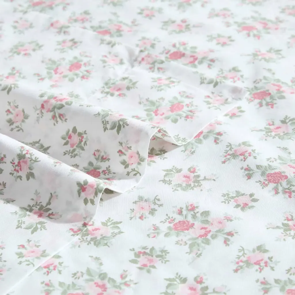 The Laura Ashley Leanna Rose printed percale sheet set adds a charming, romantic touch to your bedroom with its timeless floral design in a beautiful mauve pink. These sheets are cool to the touch, breathable, and lightweight, providing lasting comfort that becomes softer with each wash. Perfect for mixing and matching Laura Ashley comforters, duvet covers, or quilts, they effortlessly enhance a solid white bedding ensemble with a pop of color. The fully elasticized fitted sheet ensures a snug, secure fit and prevents slipping from the mattress, while the set fits queen and king mattresses up to 18" deep (16" deep for twin size, 17" for full size). Machine washable for easy care, this set offers both style and convenience.