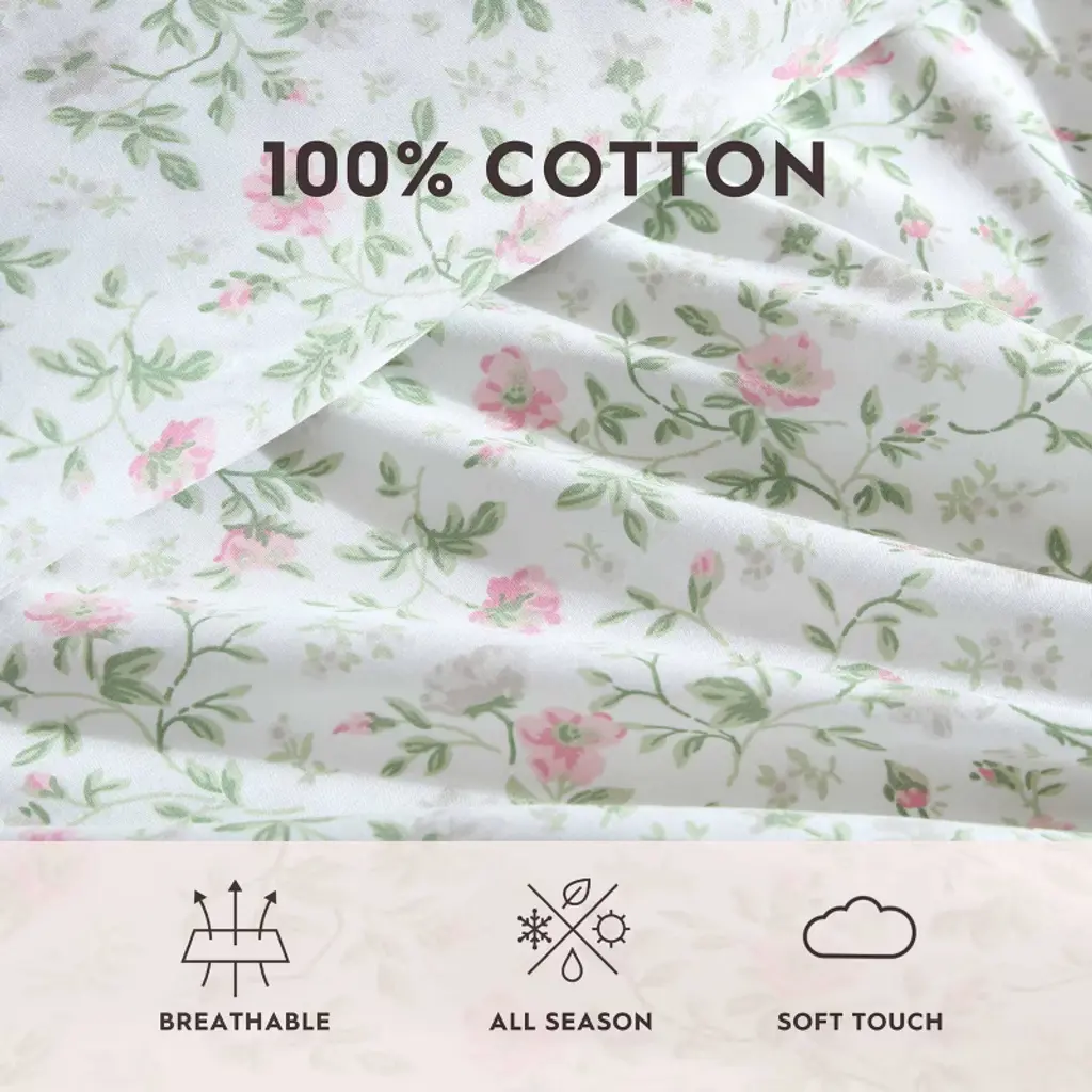 Drift into a restful night's sleep with the Laura Ashley cotton percale printed hem sheet set, designed for softness, breathability, and timeless charm. Crafted from 100% cotton percale, these sheets offer a crisp, lightweight feel for year-round comfort. The delicately printed hem detail adds a touch of elegance, making this set a perfect addition to any bedroom. The twin and full set includes one fitted sheet, one flat sheet and one standard pillowcase, while the queen set includes two standard pillowcases, and the king set includes two king size pillowcases. Machine washable for effortless care.