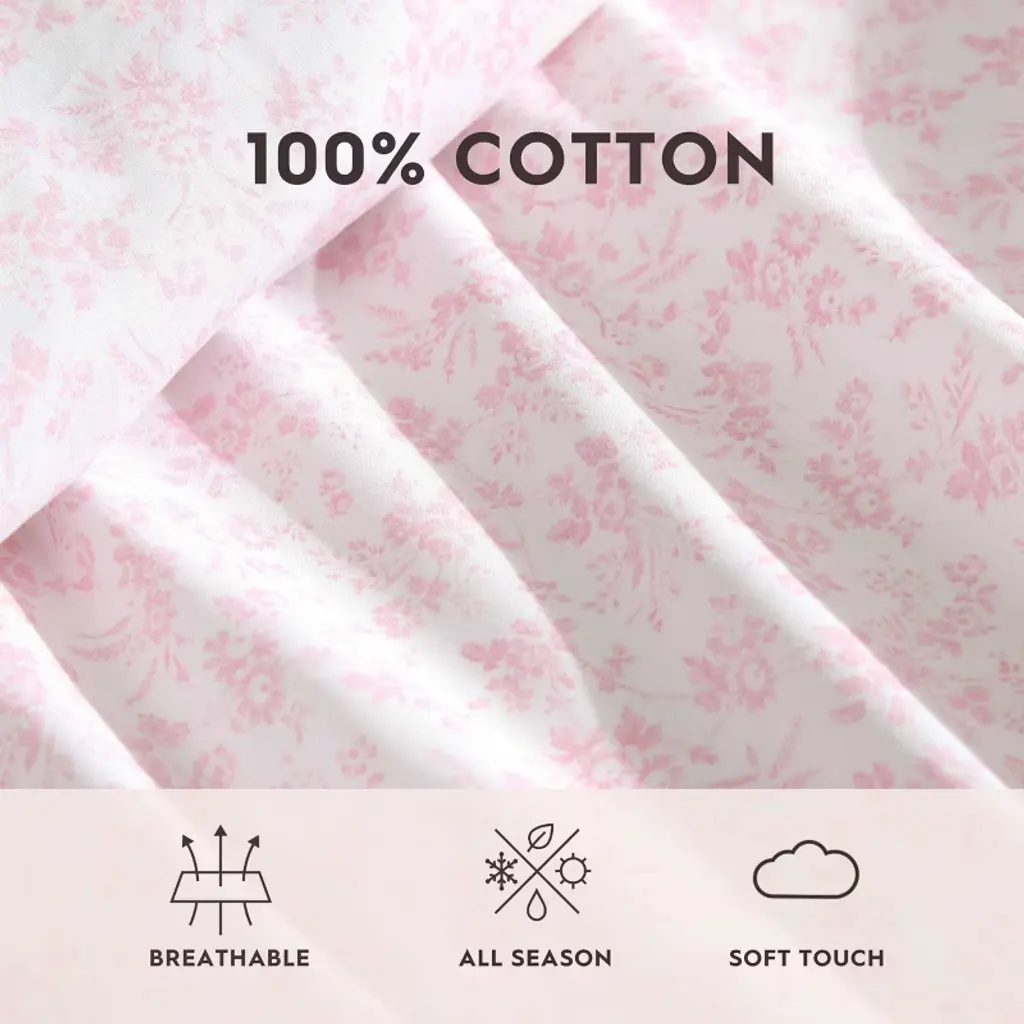 Experience the perfect blend of crisp comfort and timeless style with Laura Ashley's percale sheet sets. Crafted from 100% cotton percale, these sheets offer a cool, breathable feel with a smooth, lightweight texture ideal for year-round use. The durable fabric provides long-lasting softness, while the refined design enhances any bedding ensemble. The twin, twin xl, full, queen, and king sets each include one fitted sheet, one flat sheet, and two pillowcases (one pillowcase for twin and twin xl. Deep pockets on the fitted sheet provide a secure fit, and the high-quality construction offers durability and everyday luxury. Machine washable for easy care
