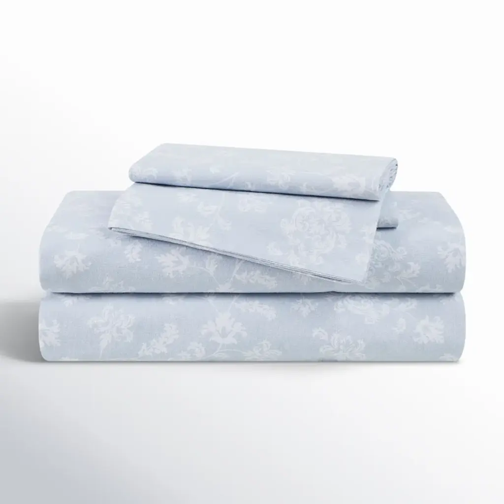 Bring a fresh look to your bed with Laura Ashley cotton flannel sheet sets, available in timeless prints and solid colors to complement any bedding ensemble. Crafted for ultimate comfort and warmth, these sheets undergo an 8-level brushing process, ensuring a luxuriously soft and cozy feel. The fully elasticized fitted sheet features premium elastic around all four sides for a secure fit, accommodating mattresses up to 15" deep (12" for twin size). Each machine-washable set includes one flat sheet, one fitted sheet, and two pillowcases, making it a perfect blend of style, quality, and convenience.