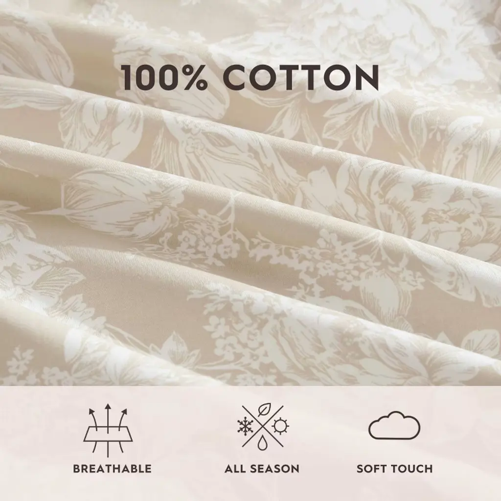 Laura Ashley printed percale sheet sets bring a charming, romantic touch to your bedroom with timeless floral designs in beautiful color palettes. Perfect for mixing and matching with Laura Ashley comforters, duvet covers, or quilts, these sheets effortlessly add a hint of color. Crafted from breathable, lightweight cotton, they are cool to the touch and become softer with each wash for long-lasting comfort. The fully elasticized fitted sheet ensures a secure fit, accommodating mattresses up to 18" deep for queen and king (16" for twin, 17" for full). Each machine washable set includes one flat sheet, one fitted sheet, and two pillowcases (one for twin and twin xl sizes) for a perfectly polished look.