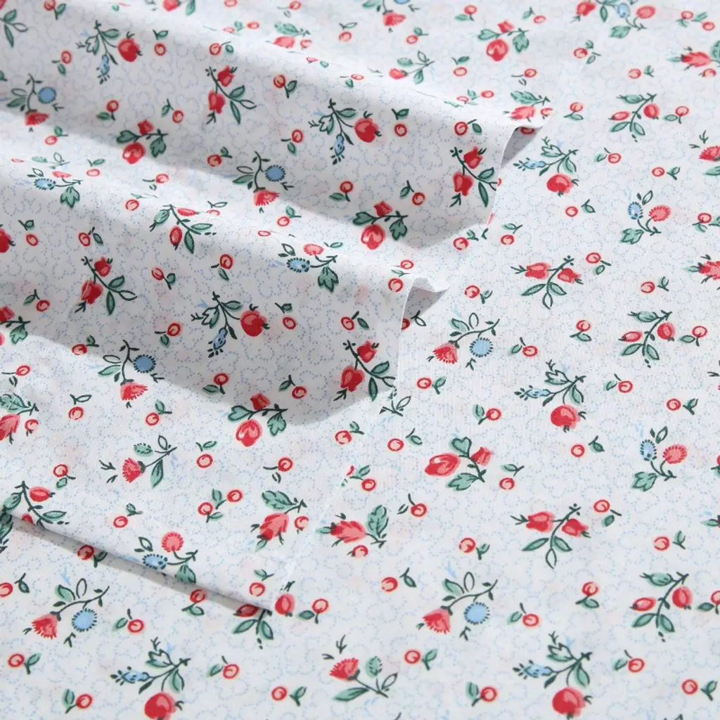 Laura Ashley printed percale sheet sets add a charming romantic touch to your bedroom with timeless florals in beautiful color palettes. Introducing the Aylesmore Ditsy sheet perfect for those who appreciate classic beauty. This design features lush pink Roses intertwined with delicate green Leaves against a subtle ground. This pattern creates a cozy yet stylish atmosphere to your bedroom. Mix and match them with Laura Ashley comforters, duvet covers or quilts. Add a dash of color to a solid white bedding ensemble. These 200 thread count sheets are cool to the touch, breathable and lightweight. Perfect for long-lasting comfort, they become softer with each wash. Each sheet set includes one flat sheet, one fitted sheet, and two pillowcases (one for twin and twinxl sizes). The fully elasticized fitted sheet prevents slipping from the mattress and ensures the perfect fit. This set fits queen and king mattresses up to 18" deep (16” deep for twin size, 17" for full size). Machine washable for easy care.