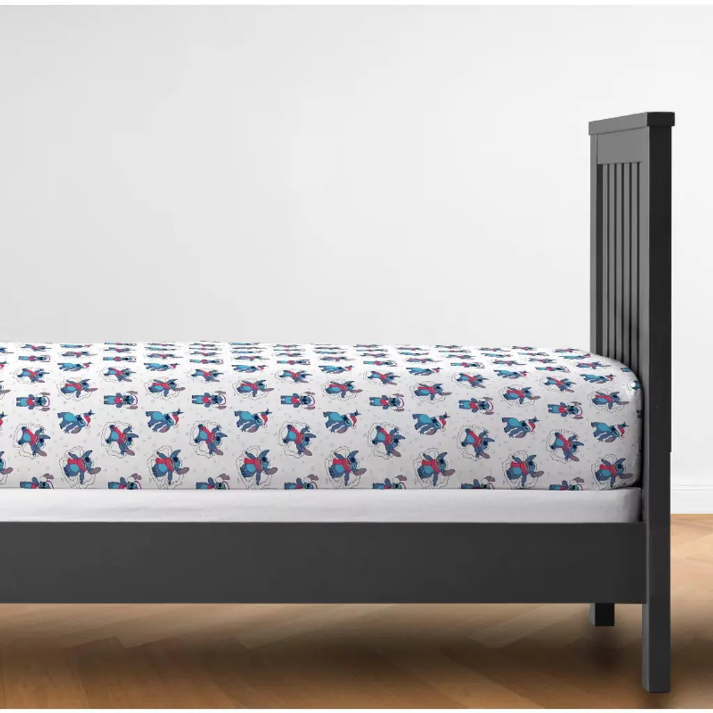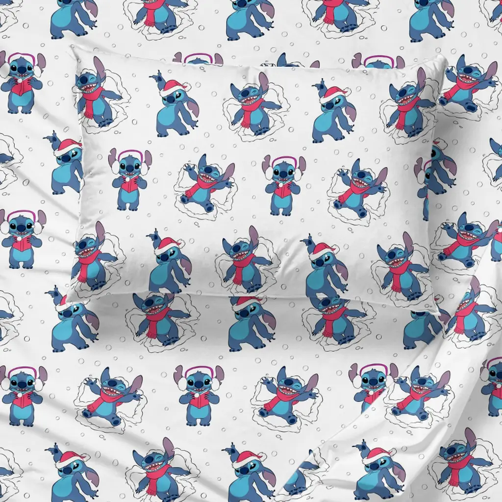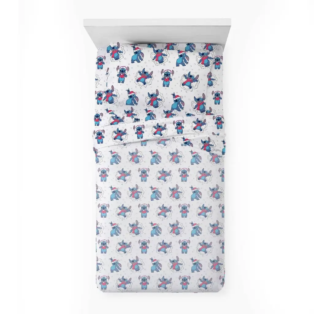 Bring festive fun to bedtime with this holiday Stitch twin sheet set, including a flat sheet (96" x 66"), fitted sheet (75" x 66"), and pillowcase (20" x 30"). Made from 100% soft polyester, it’s cozy, durable, and easy to care for—simply machine wash cold and tumble dry low. Featuring Stitch in a cheerful holiday design, this set adds comfort, charm, and seasonal Disney magic to any bedroom.