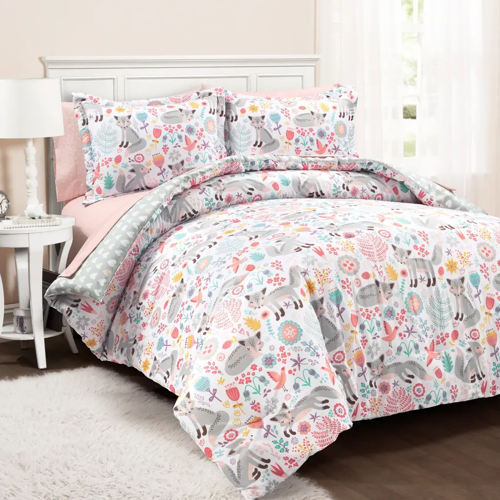 Decorating your child's bedroom has never been easier! With this complete reversible five piece comforter and sheet set, you can style their space with adorable colors and patterns for a woodland or animal themed look they are sure to love.Sweet dreams are coming your way. This cute fox print bedding and sheet set is just too cute for words! The adorable subtle print is perfect for any little girl's room. And the best part? The comforter and sheet set are each printed with a lovable reverse pattern for endless styling options. This full set includes one comforter, one sham, one fitted sheet, one flat sheet and one pillowcase. Please refer to label for full care instructions.Features:Twin-XLFull