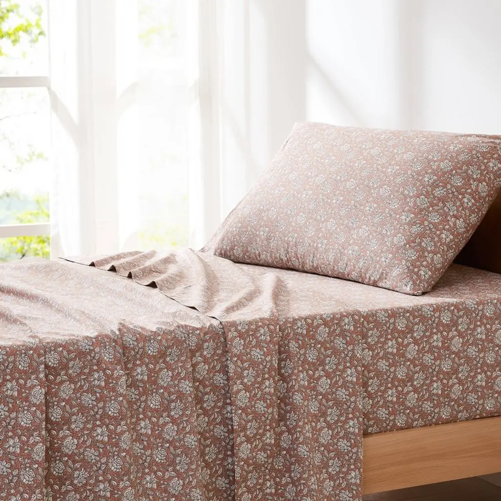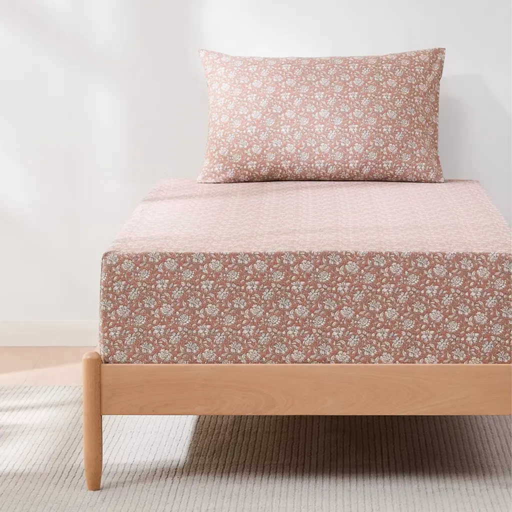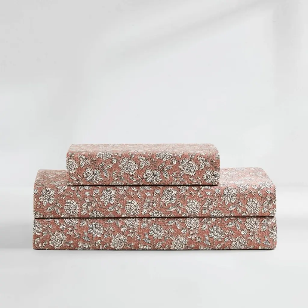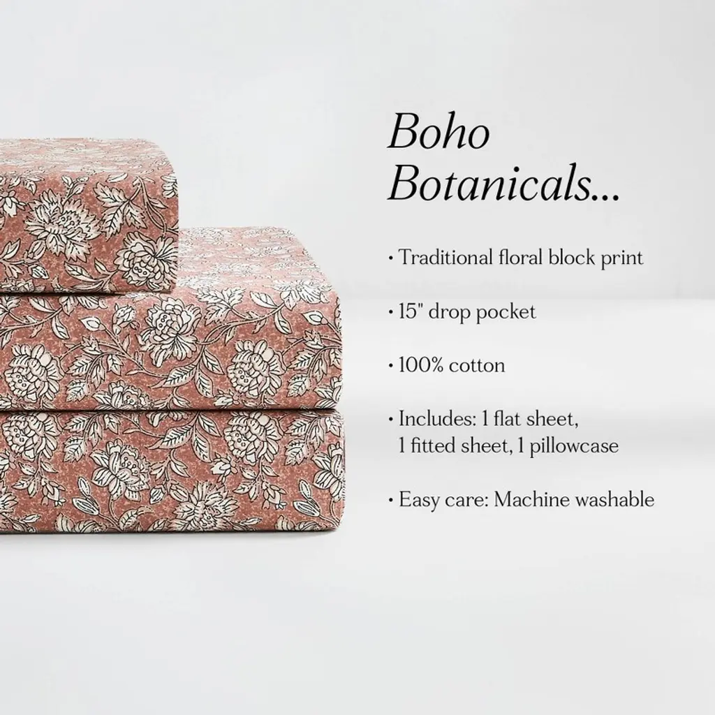 Add florals to your bedscape with this block print sheet set. You'll feel like you've stepped into a garden with these floral bed sheets! The traditional block print complements vintage or cottage styled kid's or teen's bedrooms. Crafted from 100% cotton for ultimate comfort. This 3 piece set includes 1 flat sheet, 1 fitted sheet, and 1 pillowcase. STANDARD 100 by OEKO-TEX® certified, all components have been tested and certified free from harmful substances. Machine washable for easy care.