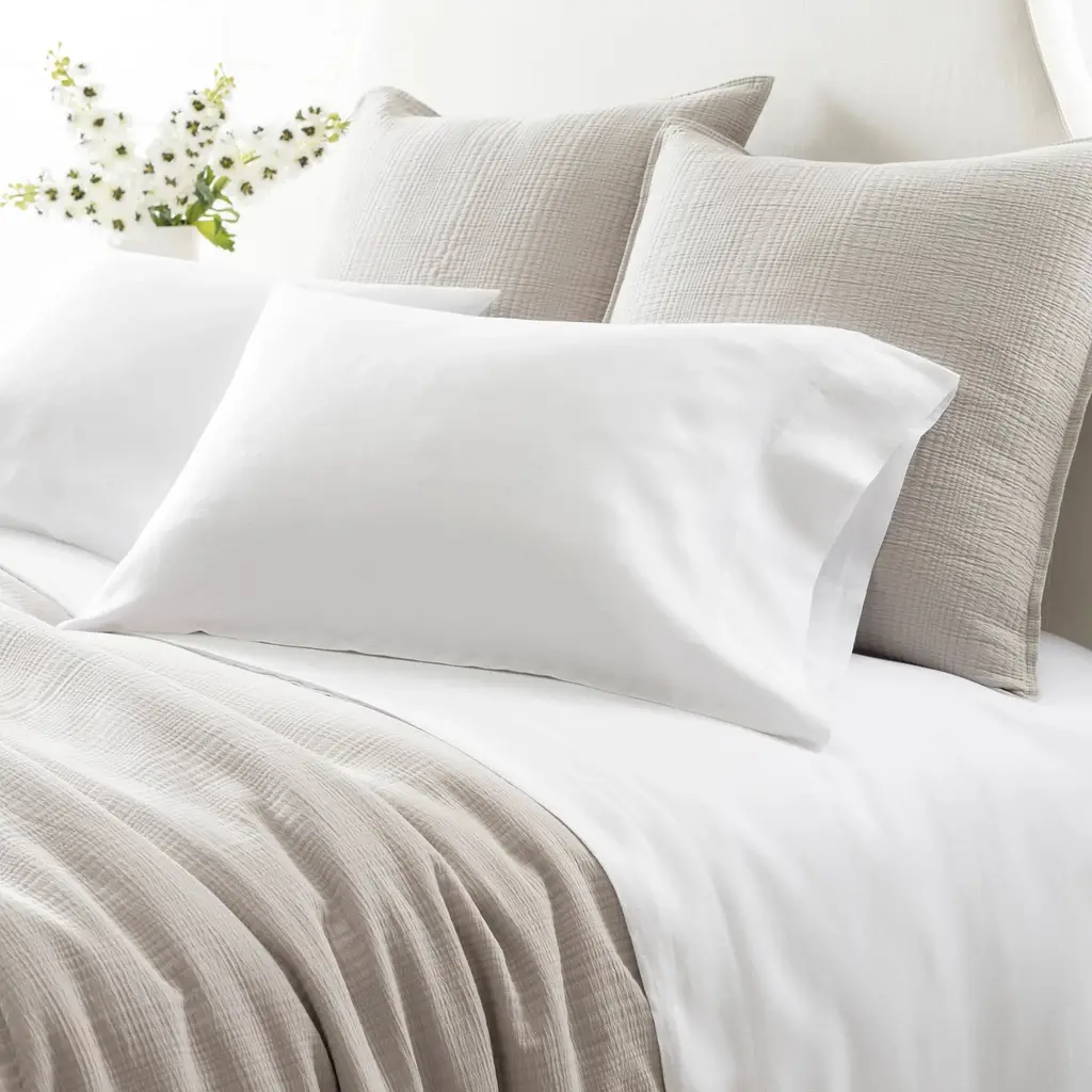 Masculine salt-and-pepper marled weave combines black and white slubby threads to give our Lush Linen sheets and pillowcases a reliably urban touch. Softly stonewashed for a perfectly lived-in rumpled suppleness, our linen bedding only gets better over time. Feels as good as it looks and naturally regulates temperature, keeping you cool in warm weather and warm in cooler months.