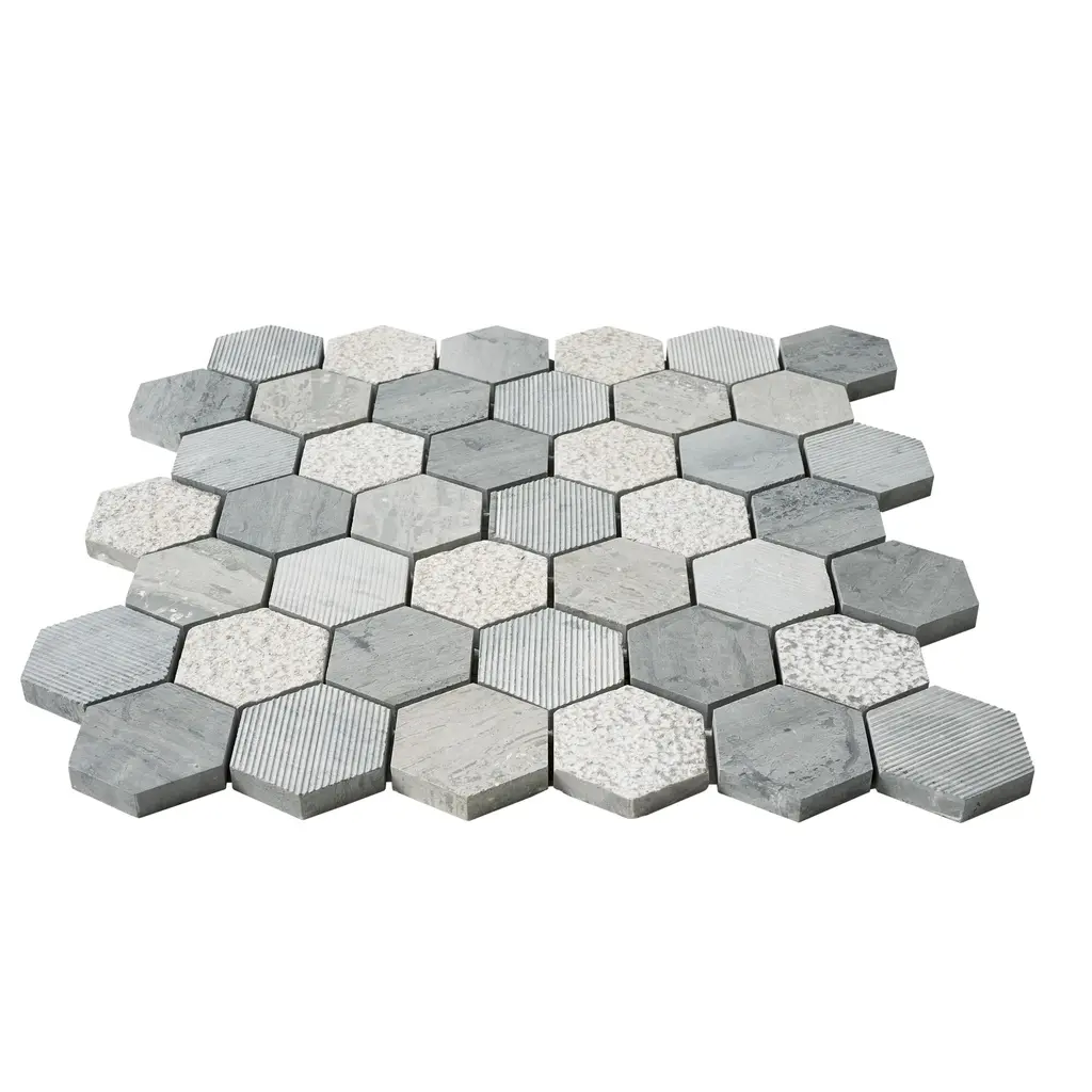 Marinewood 2"x2" Honeycomb is a type of mosaic tile used for flooring or wall covering. It features a hexagonal shape with a size of 2 inches and a textured surface for added dimension. The light blue color mimics driftwood. The hexagonal shape adds a unique touch to the design and the textured surface provides a tactile experience. This tile is suitable for both residential and commercial spaces and can enhance the design of kitchens, bathrooms, and other living areas. What's included?Product Details Sample Details